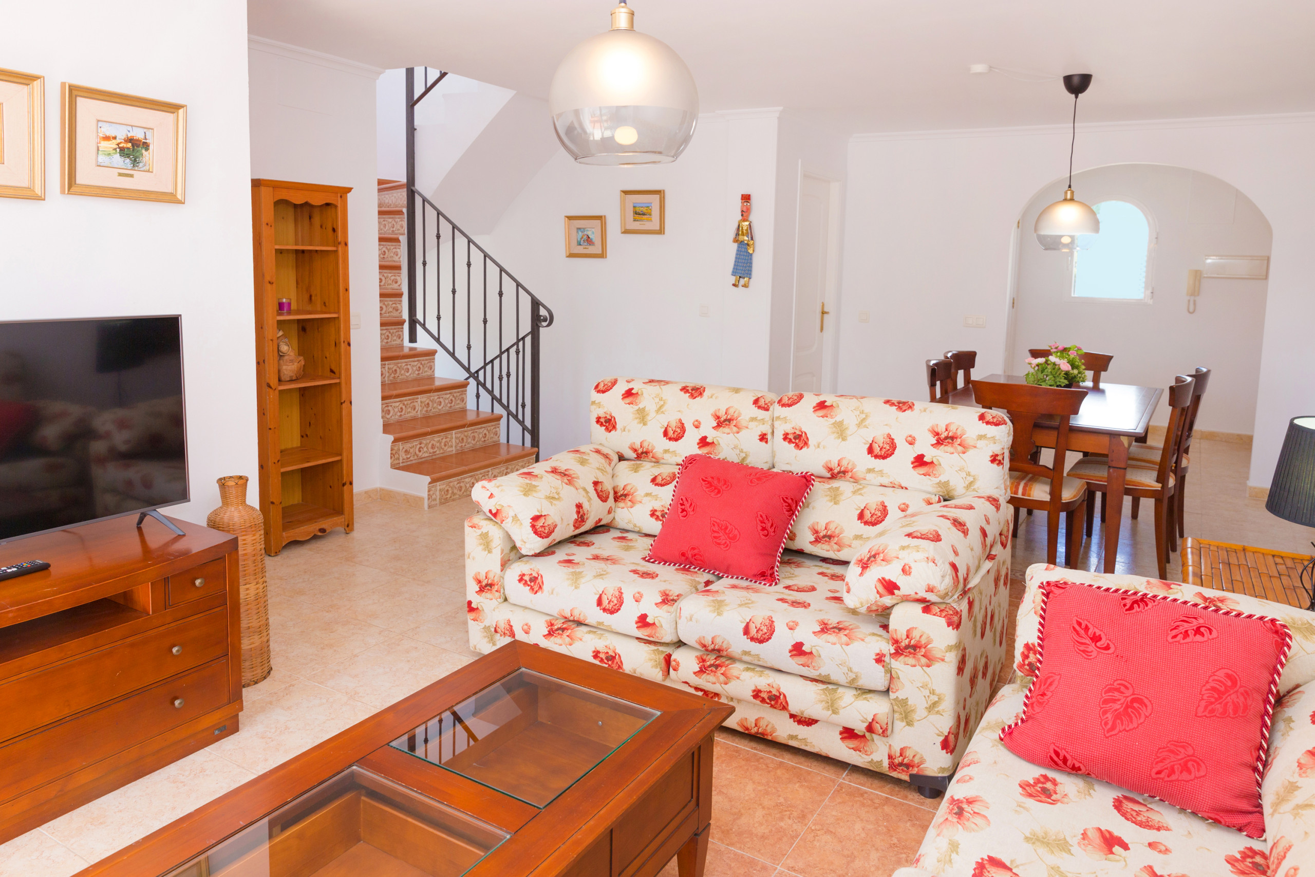 En la planta principal se encuentra el amplio salón comedor con cómodos sofás, gran mesa de comedor, TV de pantalla plana, WiFi gratis y puertas dobles que se abren a una bonita terraza cubierta. En este piso está la cocina independiente totalmente equipada con nevera, microondas, horno, congelador, lavadora, lavavajillas, vajilla y cubertería, utensilios de cocina, cafetera, tostadora, hervidor de agua, exprimidor y platos y cuencos. También en esta planta hay una habitación con cama de matrimonio y un baño. Las otras dos habitaciones se encuentran en la planta baja con dos camas individuales cada una y otro baño.