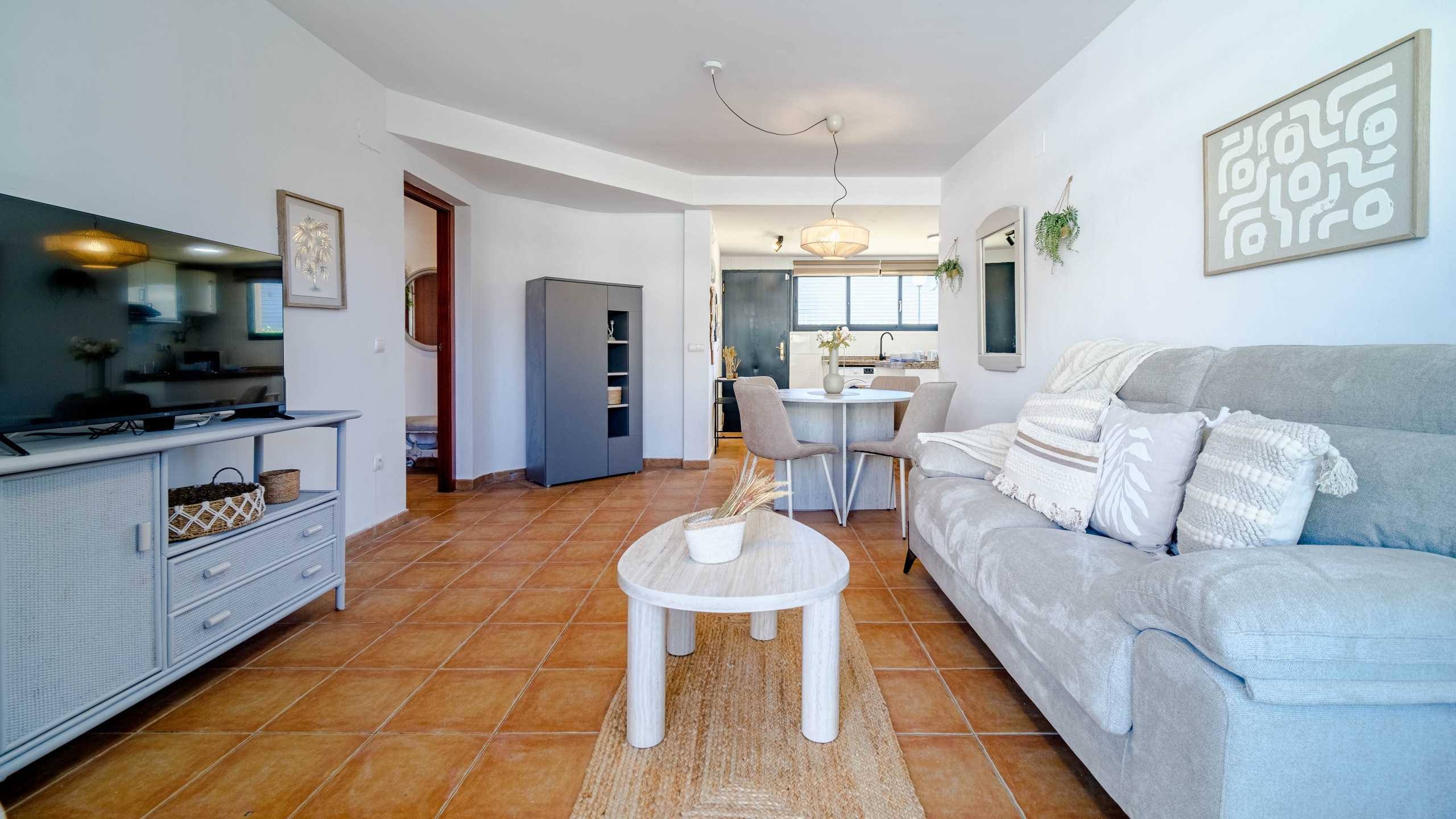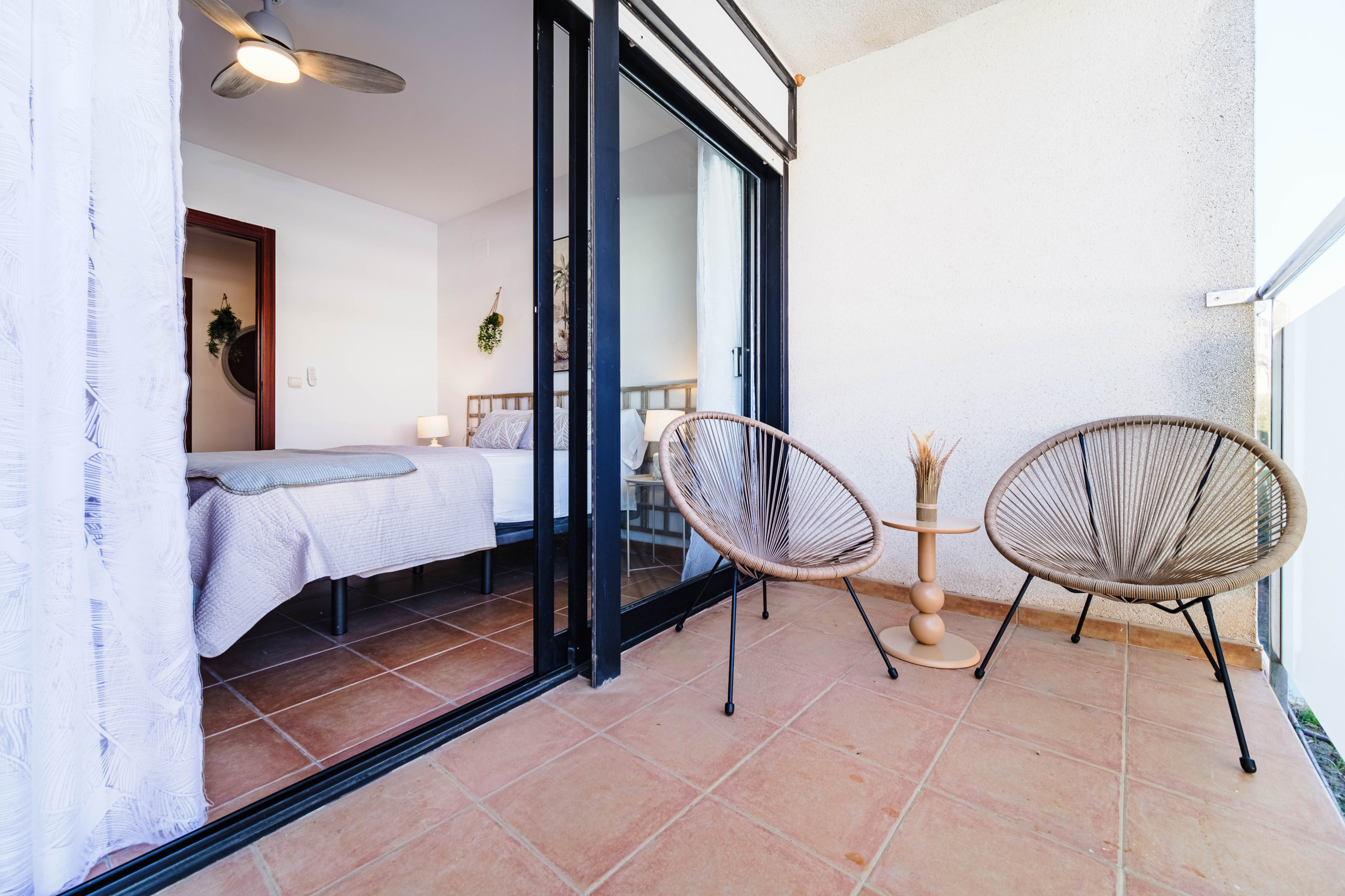La vivienda dispone de un luminoso salón-comedor con aire acondicionado, Smart TV y acceso directo a una terraza con mesa de comedor, perfecta para relajarse al aire libre. El alojamiento cuenta con un dormitorio con cama queen size y salida a la terraza y un segundo dormitorio con cama nido, ofreciendo una distribución versátil y funcional. También dispone de dos ventiladores de techo para mayor comodidad.