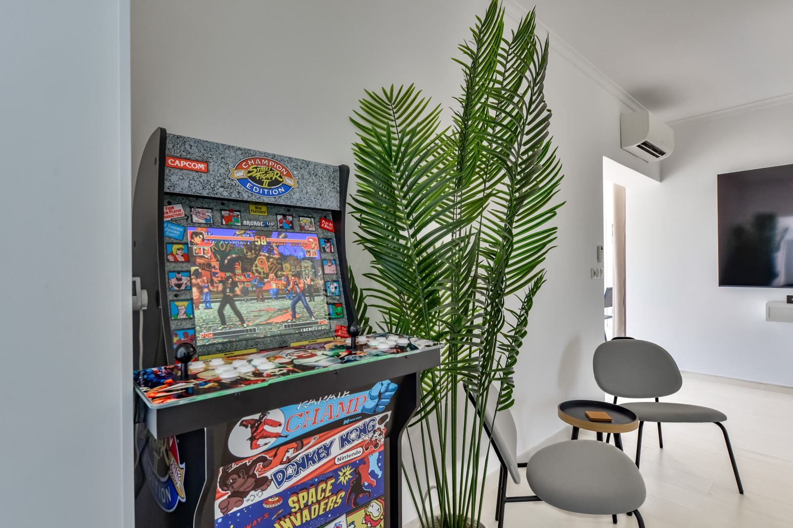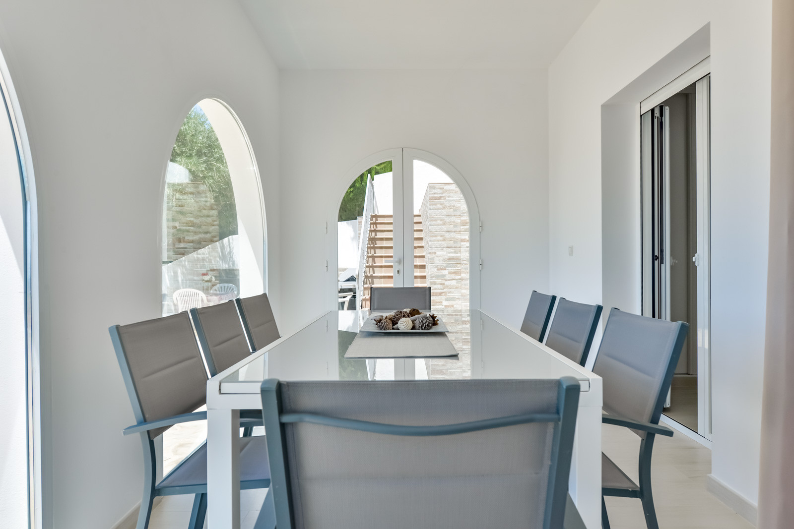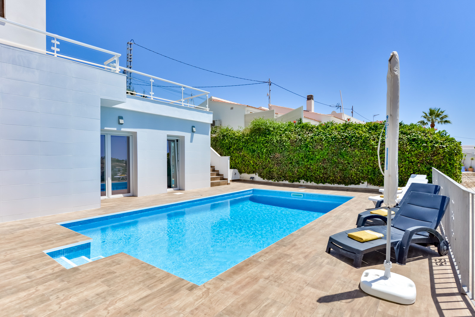 La distribución de la villa es la siguiente: Salón con aire acondicionado y una zona de comer con una preciosa luz natural, una cocina abierta y completamente equipada, Baño común con ducha, una habitación con cama de matrimonio, aire acondicionado y baño en suite con ducha, una segunda habitación con cama de matrimonio y aire acondicionado, y una tercera habitación con una litera y una cama individual (la cama de arriba esta recomendada para un niño, no un adulto) y aire acondicionado.