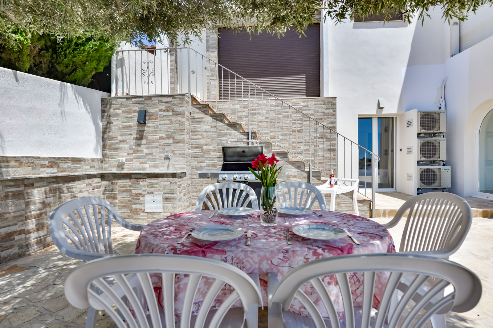 La villa tiene una vivienda principal a la que se accede bajando por un tramo de escaleras (la vivienda superior permanecerá cerrada y vacía), y se compone de un dormitorio con cama doble y aire acondicionado y baño en suite con ducha, un dormitorio con cama doble y aire acondicionado y un baño con ducha en suite, la tercera habitación con cama doble, baño en suite con ducha y aire acondicionado. cocina abierta, un salón con sofá cama, aire acondicionado y chimenea, terraza cubierta donde podrá disfrutar de comidas y cenas familiares tanto en verano como en invierno, con unas preciosas vistas al mar.