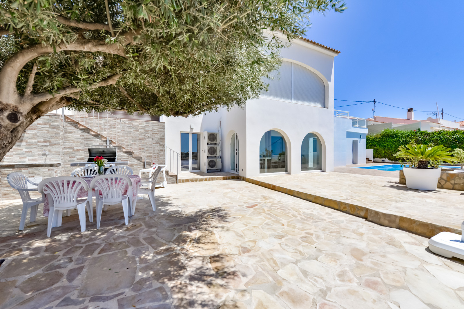 En el interior de la parcela se puede aparcar un vehículo al aire libre. La villa dispone de piscina privada de 4X8 rectangular, con escalera de construcción, rodeada de un jardín con variedad de árboles y plantas y una ducha de exterior. En la parte de atrás de la villa y cercana a la piscina se encuentra la barbacoa de obra, un cuarto de lavadora, un baño con bañera, nevera pequeña , cocina de verano de gas, con horno, y una mesa amplia para poder disfrutar con toda la familia, una zona realmente agradable para disfrutar todo el día del exterior de la villa.