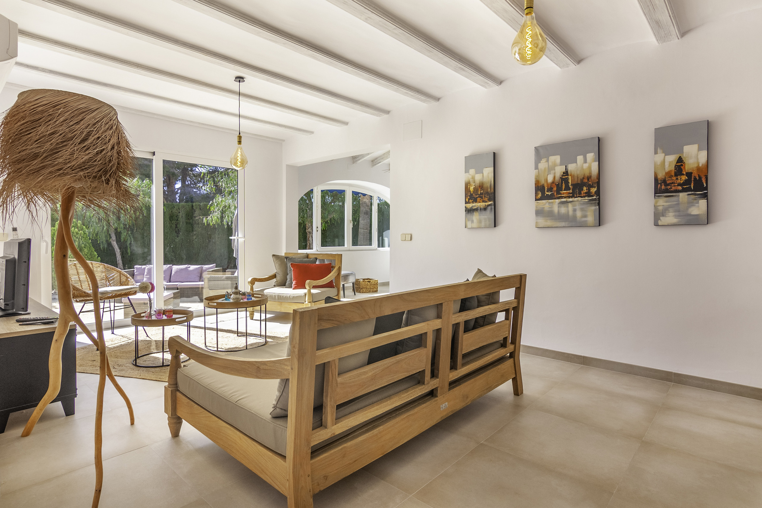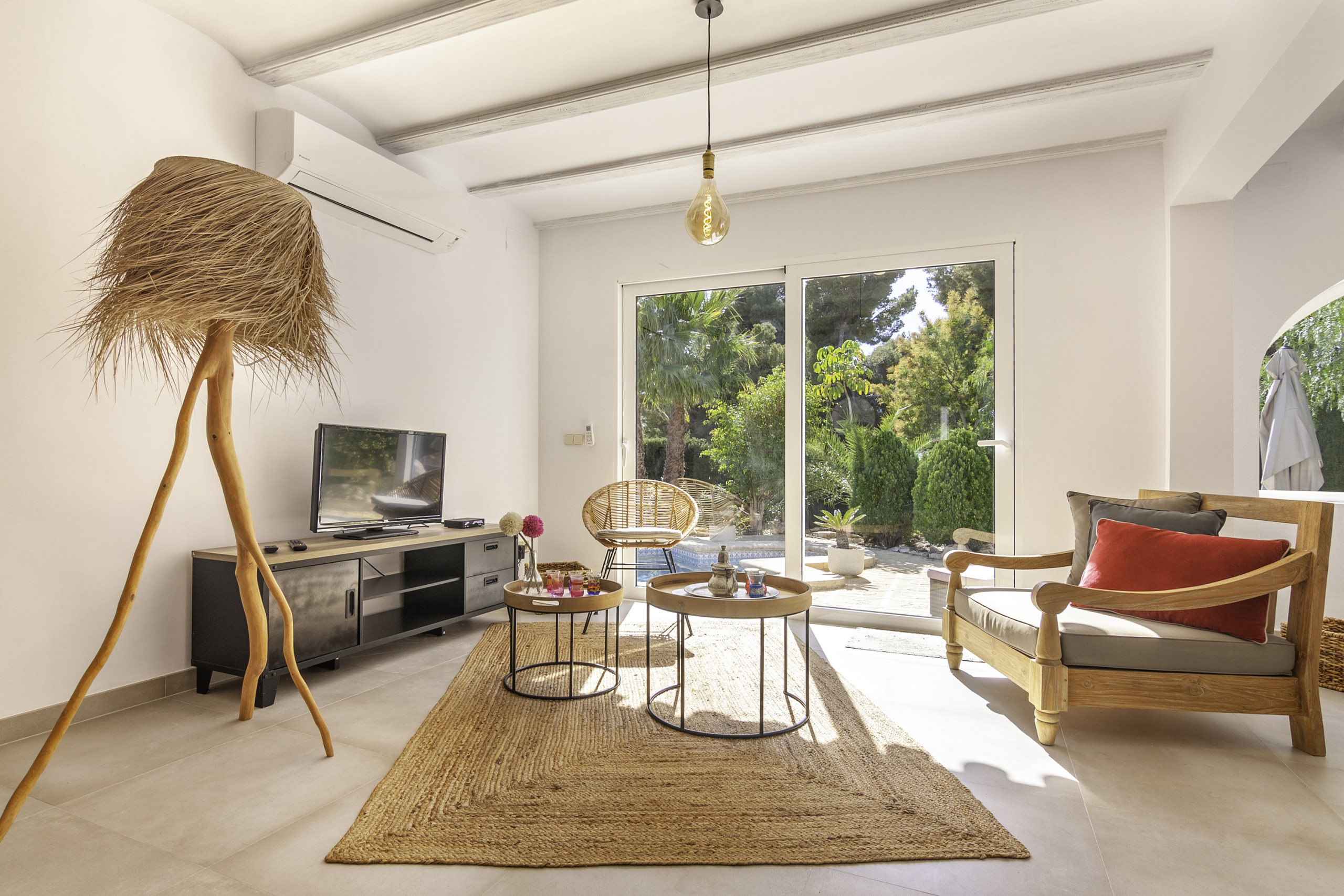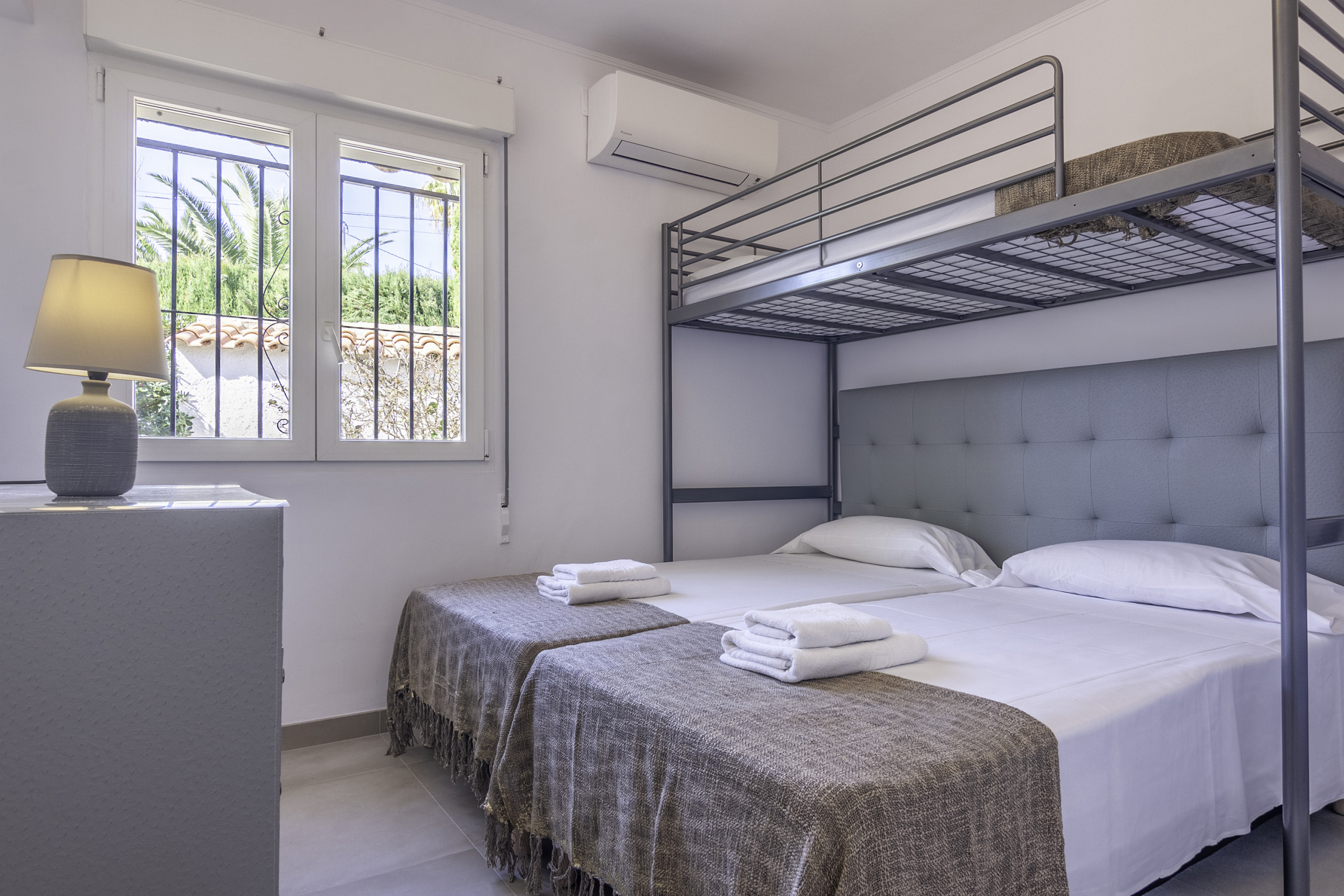 La distribución de la villa es la siguiente: Salón con aire acondicionado y una zona de comer con una preciosa luz natural, una cocina abierta y completamente equipada, Baño común con ducha, una habitación con cama de matrimonio, aire acondicionado y baño en suite con ducha, una segunda habitación con cama de matrimonio y aire acondicionado, y una tercera habitación con una litera y una cama individual (la cama de arriba esta recomendada para un niño, no un adulto) y aire acondicionado.