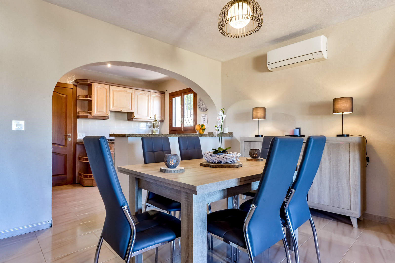 El alojamiento tiene 120 m² de vivienda a la que se accede por un tramo de escaleras de unos 16 peldaños. Lo primero que encontramos al entrar a la vivienda es un recibidor que da paso a un amplio salón comedor con chimenea de pellets, aire acondicionado, y una sala de estar con sofás para relajarse con grandes ventanales y una entrada de luz muy bonita todo el día. Una cocina abierta completamente equipada con salida al patio trasero, un baño completo con ducha y bañera, un primer dormitorio con cama de matrimonio, aire acondicionado y baño en suite con ducha. Un segundo dormitorio con cama de matrimonio y aire acondicionado y un tercer dormitorio con dos camas individuales y aire acondicionado.