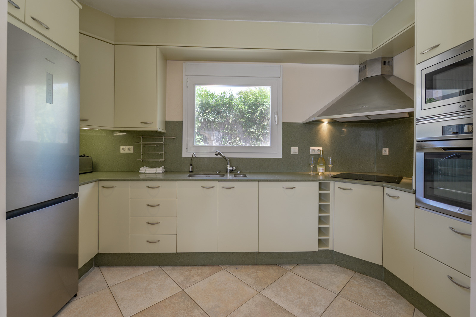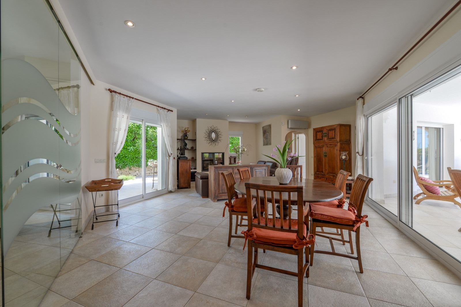 Con 150 m2 de superficie habitable, la villa se distribuye en una sola planta a la que se accede a través del hermoso jardín. En el interior hay un agradable salón-comedor con una mesa redonda para 6 personas, una zona de sofás, TV, aire acondicionado y una cocina abierta al salón que se puede separar mediante puertas de cristal originales. A un lado de la sala de estar hay un amplio dormitorio con cama doble, aire acondicionado, baño en suite con ducha y bañera y una zona para el armario y el acceso a la terraza. En el otro extremo de la casa, encontramos un baño completo con bañera, una habitación con una cama individual y aire acondicionado, una habitación con dos camas individuales juntas y aire acondicionado, un pequeño inodoro con lavabo y la cuarta habitación con una cama individual y aire acondicionado.