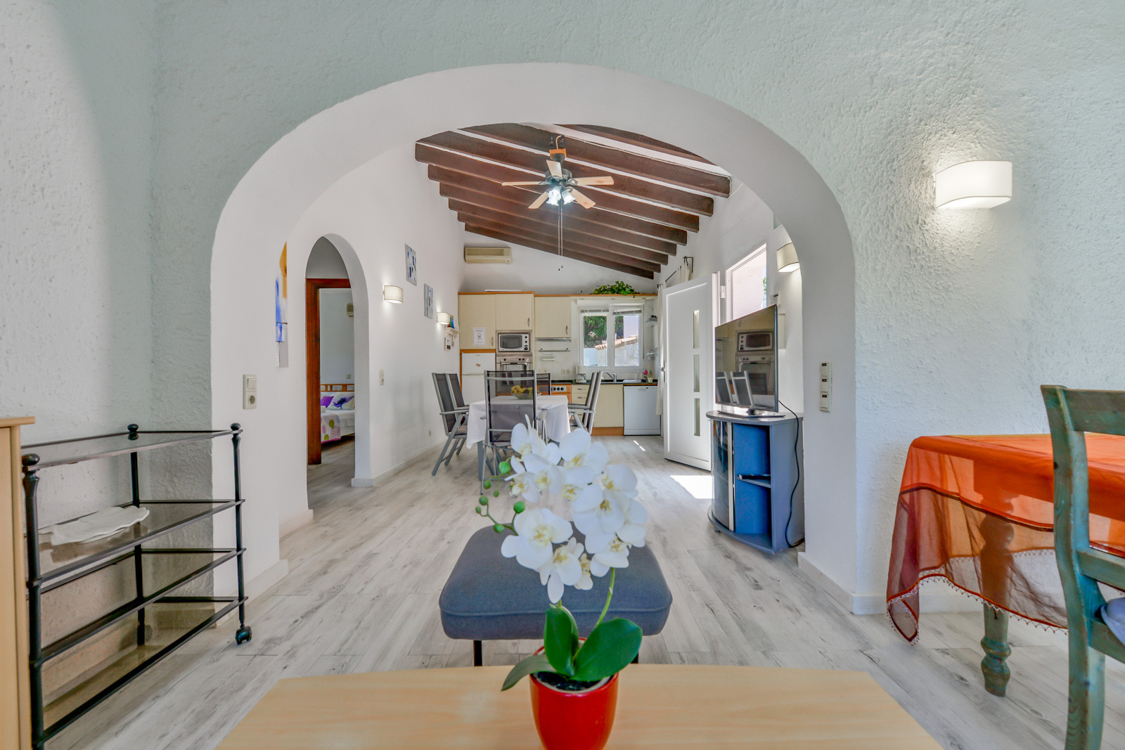 La distribución de la villa Acaepa es la siguiente: con 122 m2, en la vivienda principal encontrará un baño completo con ducha, un dormitorio con cama de matrimonio, y un segundo dormitorio con dos camas individuales, salón, cocina moderna y totalmente equipada y una agradable terraza que podrá usar tanto en verano como en invierno ya que es completamente cubierta. En la planta superior y completamente independiente con unas escaleras por el exterior, se encuentra el tercer dormitorio con cama doble confortable y con vistas abiertas a la montaña y al mar, y un baño con ducha. La villa se renovó completamente en el año 2019 y tanto su mobiliario como baños, cocina etc, son completamente nuevos. Tiene un aparato de aire acondicionado en el salón.