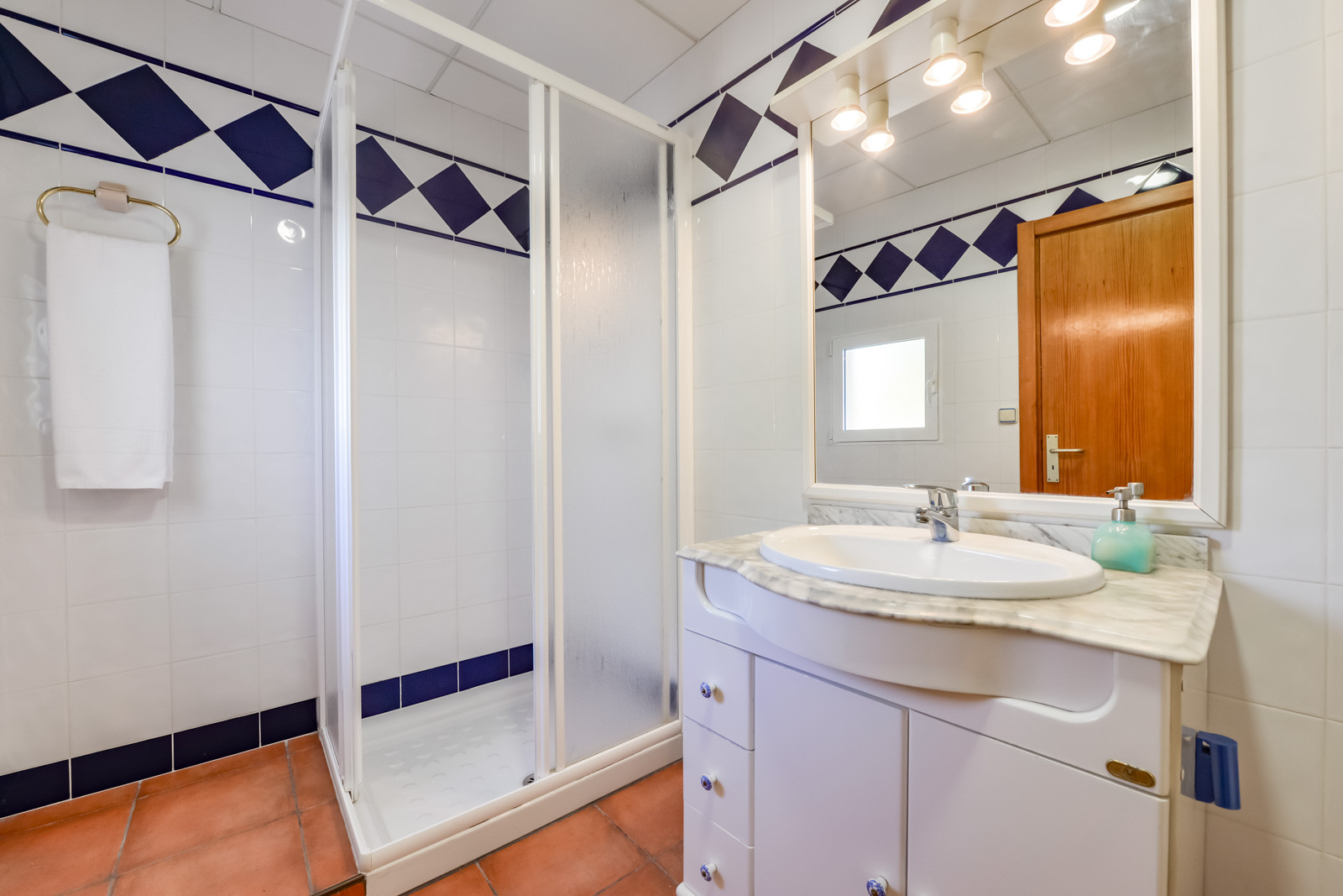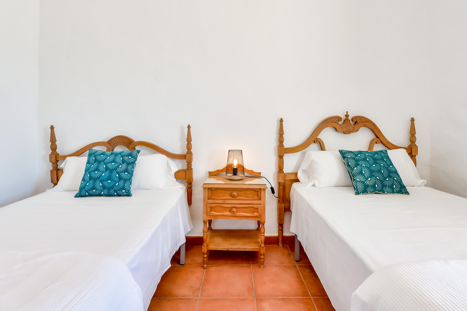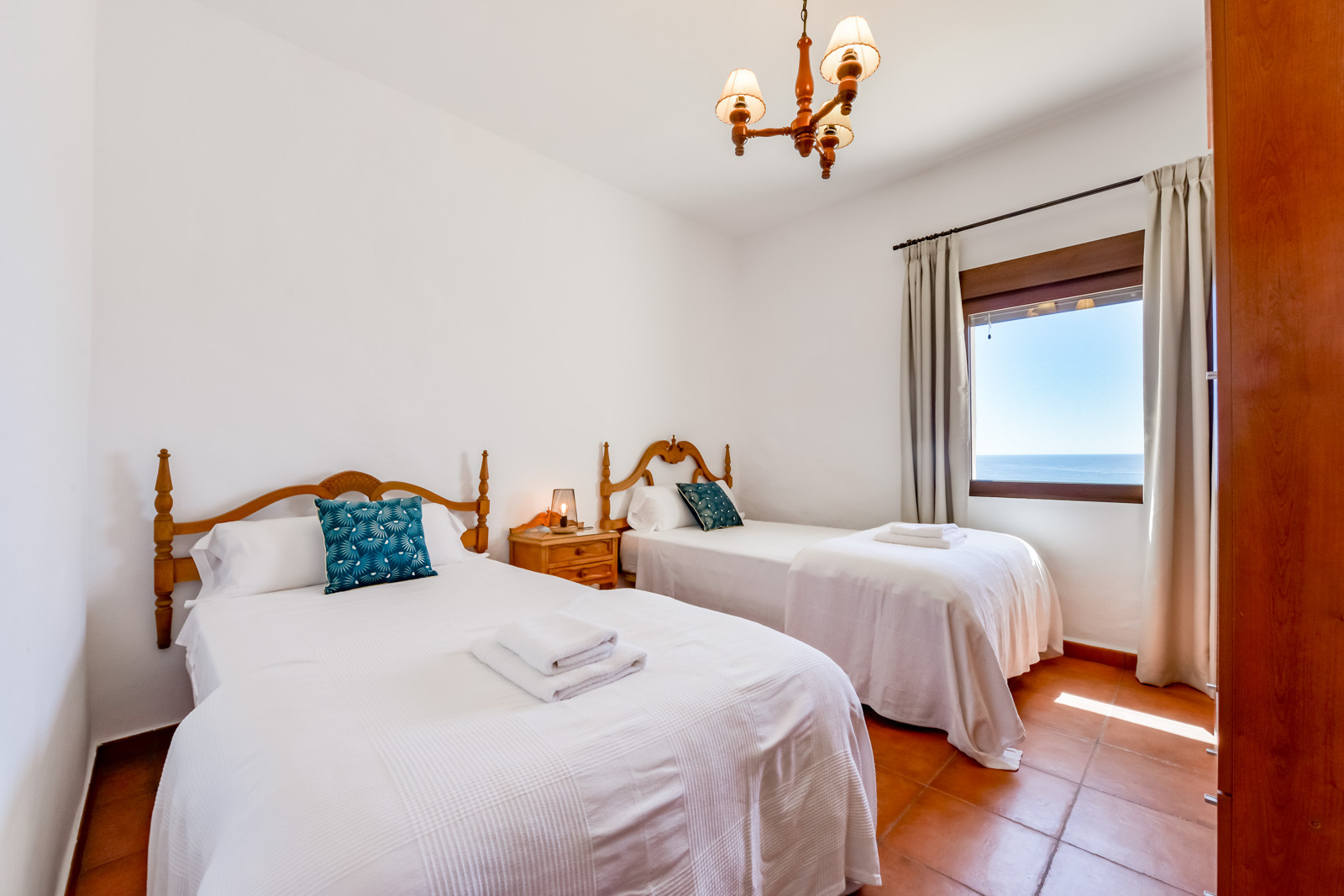 Subiendo por las escaleras desde el salón encontramos un baño completo con ducha, la tercera habitación con dos camas individuales y vistas al mar, y una cuarta habitación con cama de matrimonio y una preciosa terraza con vistas abiertas al mar.
