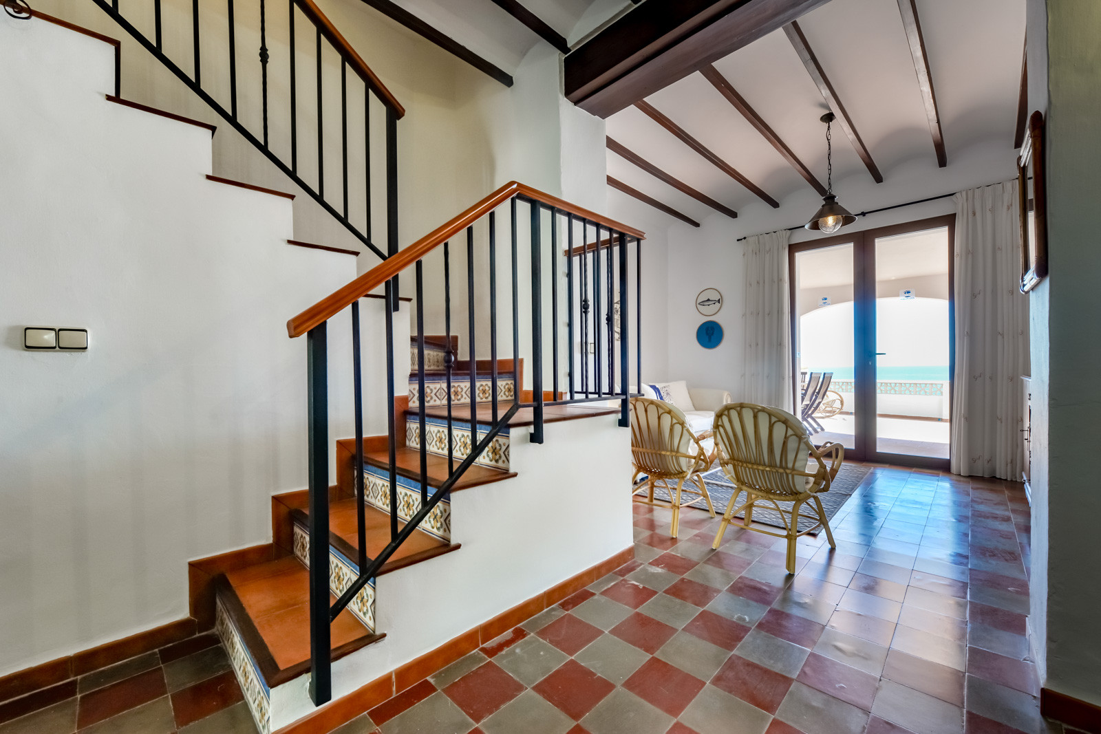 Con 150 m² de vivienda, la casa adosada se distribuye en dos plantas comunicadas por unas escaleras interiores. La planta principal dispone de una cocina de estilo rústico y completamente equipada, un salón comedor con mesa para 8 comensales, zona de tv y sofá, una habitación con cama de matrimonio y unas bonitas vistas al mar y una segunda habitación con cama de matrimonio. Desde el salón se accede a una espectacular terraza con mesa para comer y cenar mirando el mar, y asientos de exterior con unas preciosas vistas a la playa del Portet y el Peñon de Ifach de fondo. En el exterior de la casa y junto a la cocina, encontramos un baño completo con ducha.