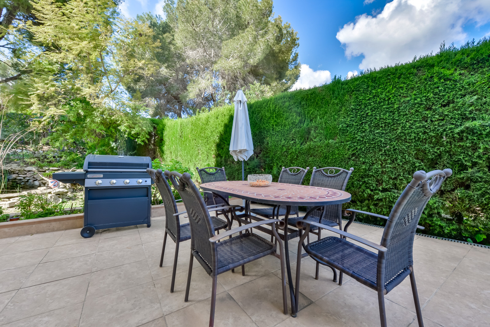 Frente al salón. encontramos una agradable y bella terraza techada con una mesa para 6 comensales, una zona de sofás de jardín y frente a ella, la piscina de agua clara con escaleras de obra tipo playa para disfrutar de un relajante baño. La piscina es de agua salada, un sistema para mantener la calidad del agua y la piel de forma mas saludable. Una zona de hamacas para tomar el sol, y una jardín con una bonita Rocalla que le da nombre a la preciosa villa. Olivos, jazmines y otras plantas mediterráneas rodean la villa haciendo de ella algo autentico y especial.