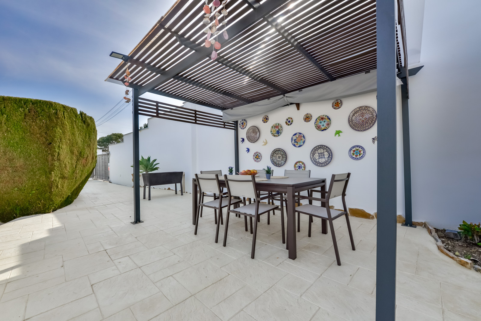 Exterior de la villa: Con una parcela de 1000m2, tiene una zona de aparcamiento para varios coches, y una amplia zona de piscina con ducha exterior de obra, zona de hamacas para tomar el sol, mesa para comer y una barbacoa de obra.