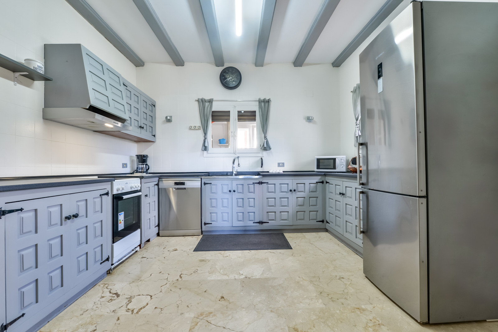 Encontramos un amplio salón comedor con aire acondicionado una chimenea decorativa, una cocina amplia independiente y completamente equipada, un primer dormitorio con con dos camas individuales, aire acondicionado y baño completo en suite con ducha. Un segundo dormitorio con cama de matrimonio y aire acondicionado. un tercer dormitorio con dos camas individuales y aire acondicionado. y un cuarto dormitorio con cama de matrimonio, baño completo en suite con ducha y aire acondicionado. La villa tiene un tercer baño mas, con ducha y lavabo muy amplio. Toda la villa tiene calefacción central.