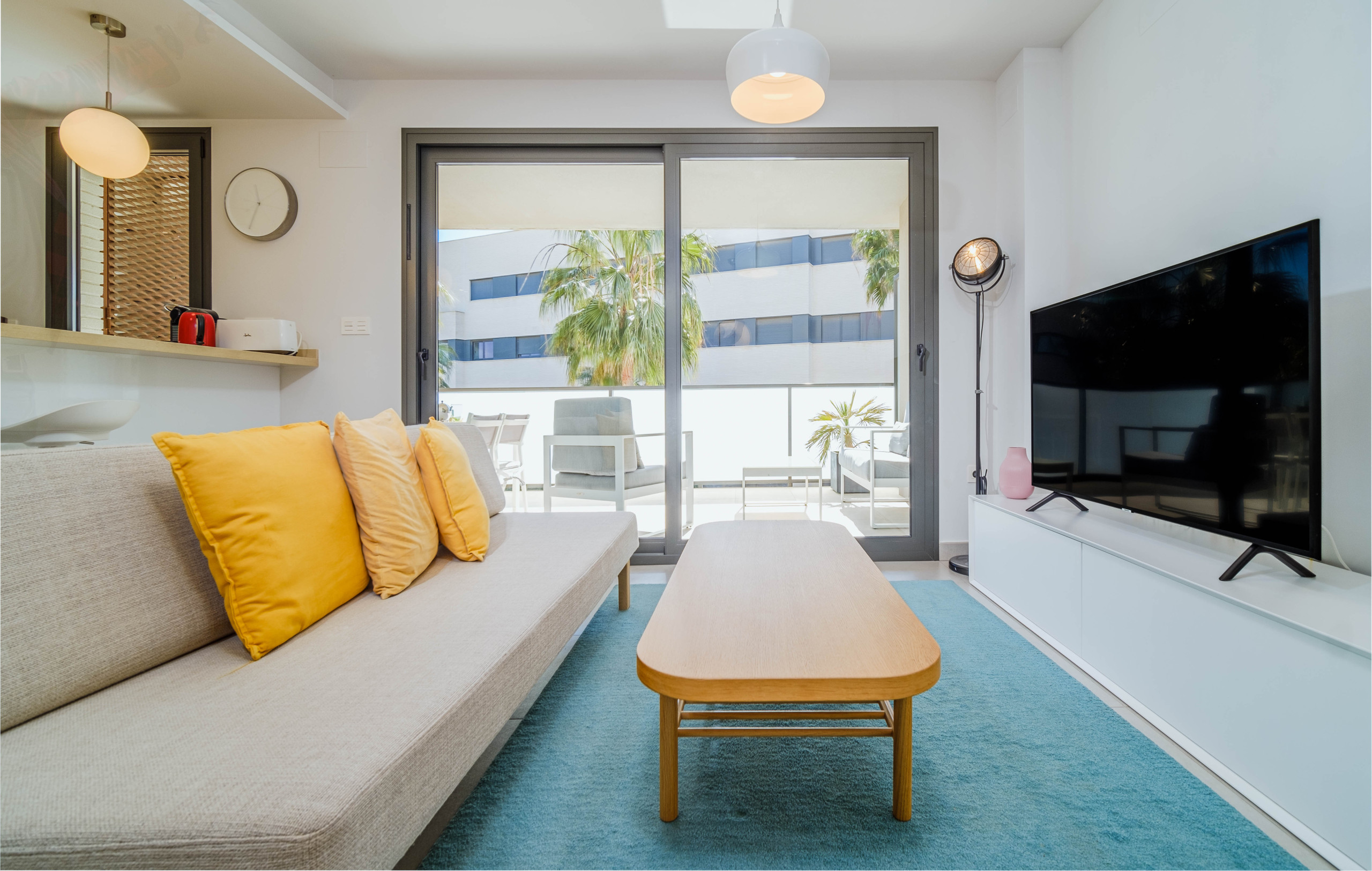 Diese stilvolle, moderne und lichtdurchflutete Wohnung hat 89 m² und wurde kürzlich renoviert und dekoriert. Die Wohnung, auf einer Ebene verteilt, verfügt über 3 wunderschöne Schlafzimmer und 1 Badezimmer mit Dusche und bietet Platz für bis zu 6 Personen. Das Hauptschlafzimmer verfügt über ein Doppelbett, eingebaute Schränke und direkten Zugang zur Terrasse: Das zweite Schlafzimmer hat zwei Einzelbetten und das dritte ein praktisches Stockbett. Die Wohnung bietet auch eine moderne, voll ausgestattete offene Küche mit Kühlschrank, Mikrowelle, Ofen, Gefrierschrank, Waschmaschine, Geschirrspüler, Geschirr und Besteck, Küchenutensilien, Kaffeemaschine, Toaster, Wasserkocher sowie Teller und Schüsseln. Das geschmackvoll eingerichtete Wohnzimmer verfügt über ein bequemes Sofa, Flachbild-TV, Klimaanlage (nur Wohnzimmer), kostenloses WLAN und Doppeltüren, die sich zu einer wunderbaren Terrasse öffnen. Auf der Terrasse können wir einen großen Esstisch und herrliche Ausblicke auf den Pool, das Meer und die Berge genießen. In den Gemeinschaftsbereichen der Anlage kann man einen beeindruckenden Rasen mit Garten, Kinderspielbereich und einem großen, eingezäunten Pool mit Kinderzone genießen.