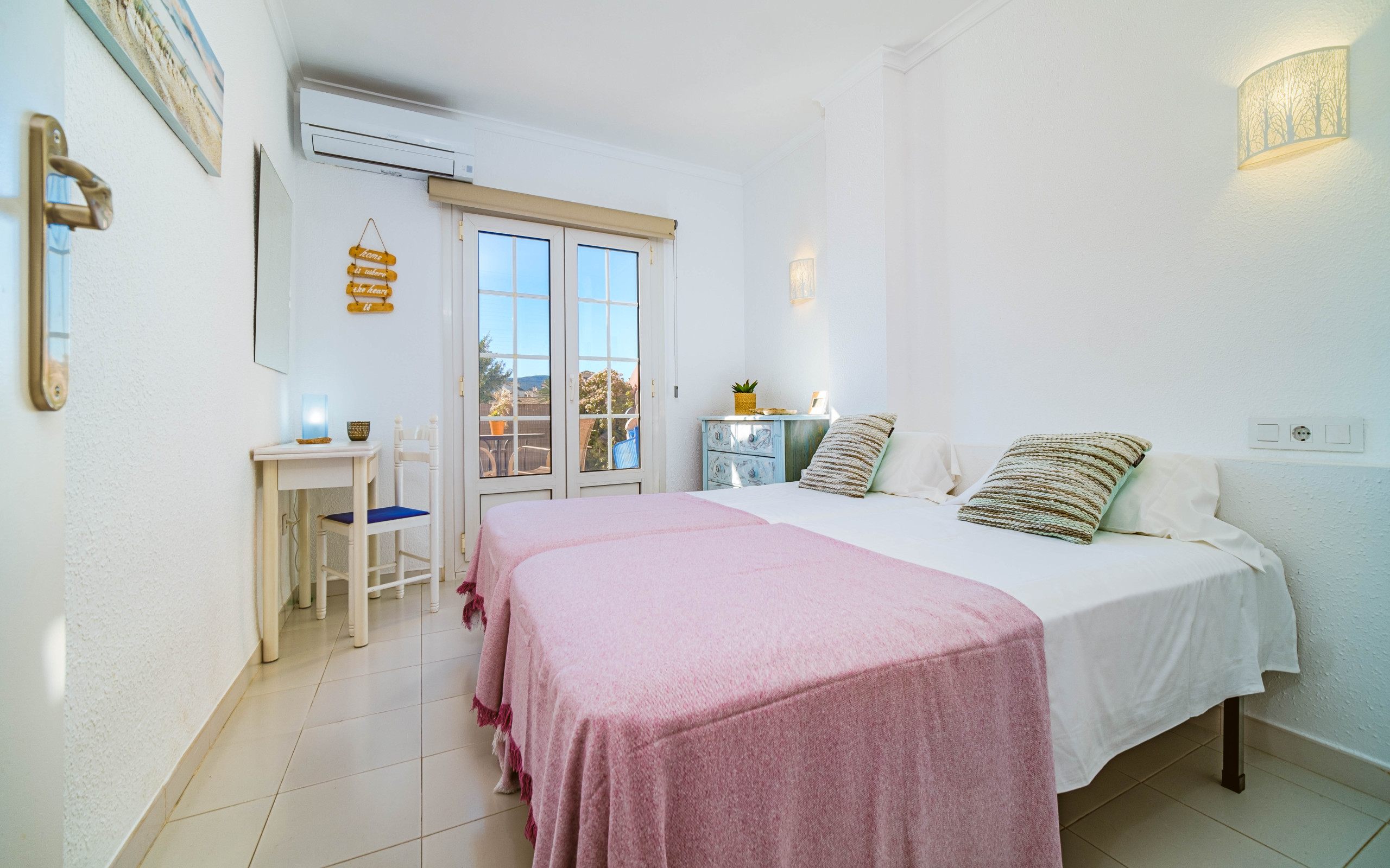 In der oberen Etage, die über eine Wendeltreppe erreichbar ist, befinden sich die Schlafzimmer und das Badezimmer mit Badewanne. Das Hauptschlafzimmer mit einem bequemen Doppelbett verfügt über Klimaanlage, eingebaute Schränke und Zugang zu einem Balkon mit wunderschönem Blick auf die Berge. Das zweite Schlafzimmer bietet ein praktisches Nestbett, ideal für einen Erwachsenen oder zwei Kinder.