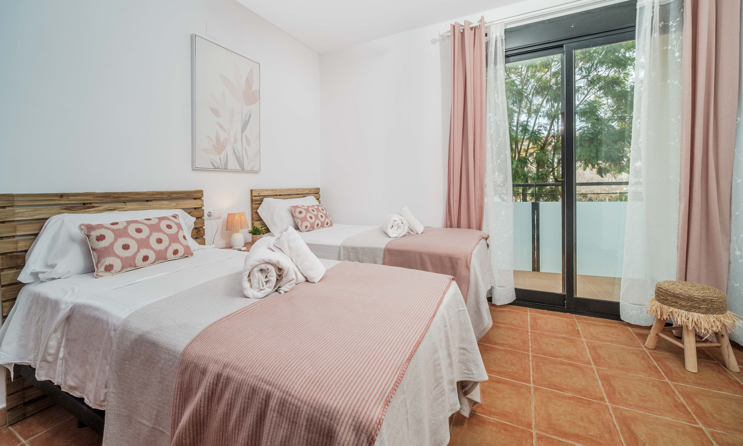 Im Erdgeschoss befindet sich ein Schlafzimmer mit einem Doppelbett (150x200), ein zweites Schlafzimmer mit zwei Einzelbetten (90x200) und ein Badezimmer mit Dusche. Im Obergeschoss gibt es ein weiteres Schlafzimmer mit einem Doppelbett (150x200), ein Schlafzimmer mit zwei Einzelbetten (90x200) und ein Badezimmer mit Badewanne. Alle Schlafzimmer verfügen über einen Balkon, Rollläden und Deckenventilator.