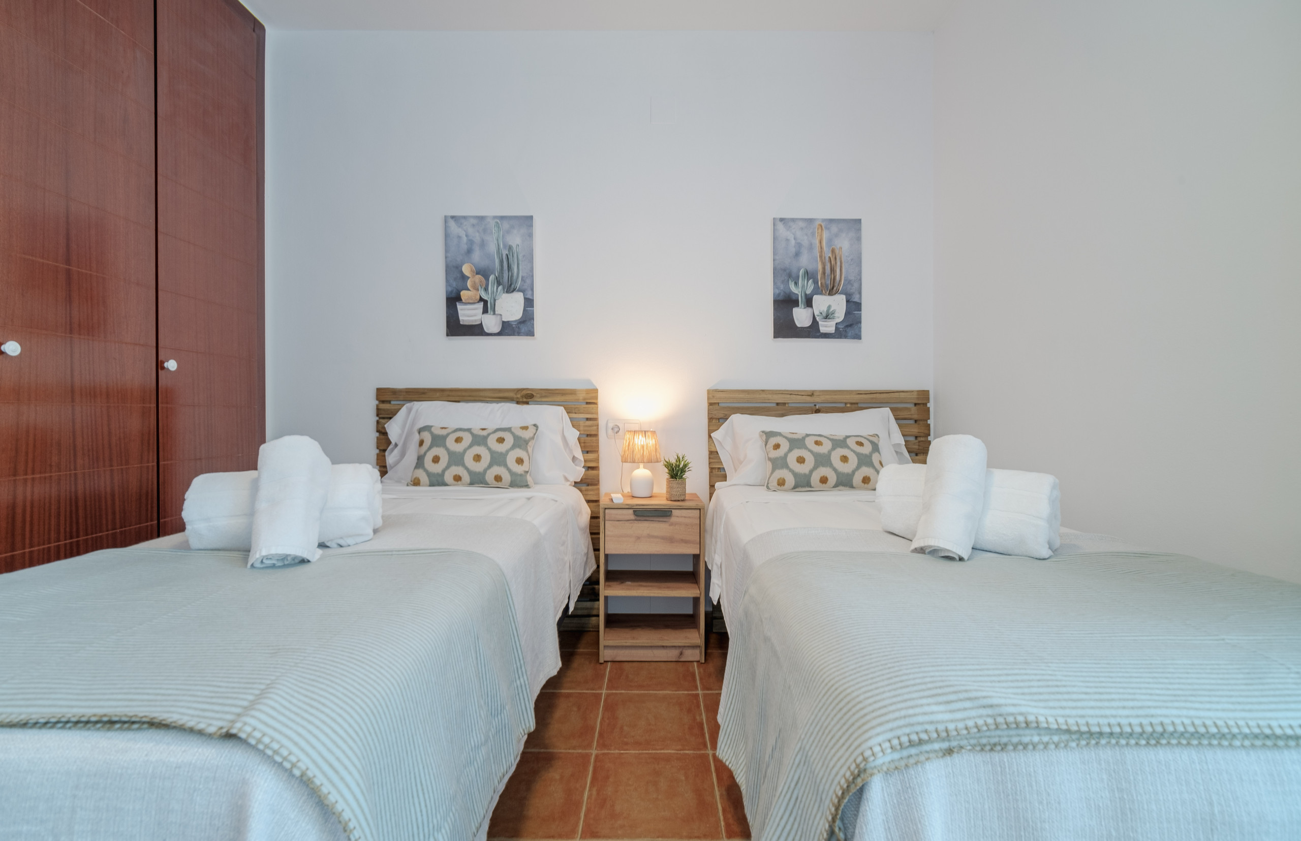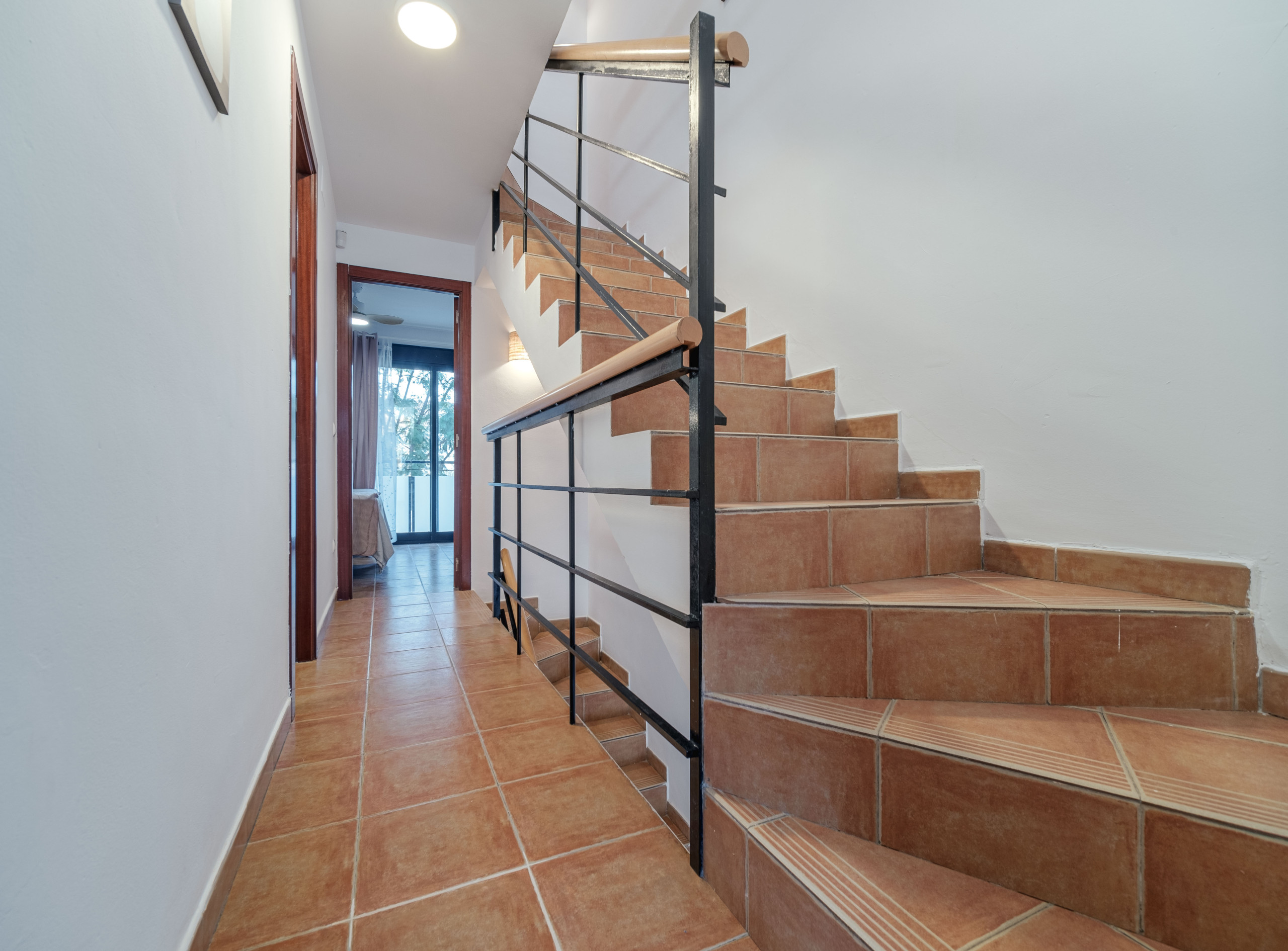 Vom Wohnzimmer aus führt eine Treppe in die beiden oberen Stockwerke. Die zweite Etage bietet ein vollständiges Badezimmer mit Badewanne, ein Schlafzimmer mit Etagenbett und ein weiteres Schlafzimmer mit Doppelbett und eigenem Badezimmer mit Badewanne. Schließlich befinden sich im obersten Stockwerk die beiden letzten Schlafzimmer, eines mit Doppelbett und eigenem Badezimmer mit Dusche und ein weiteres Schlafzimmer mit zwei Einzelbetten, beide mit Zugang zu einer Solarium-Terrasse.