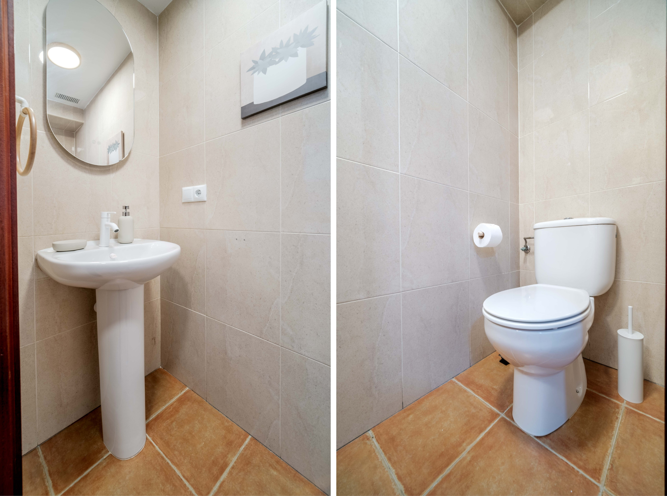Im Erdgeschoss befinden sich drei Schlafzimmer: eines mit einem Bett von 140x200 und zwei mit Doppelbetten von 160x200, alle mit Deckenventilator und Kleiderschrank. Das Hauptschlafzimmer verfügt über ein eigenes Badezimmer und Zugang zur Terrasse. In dieser Etage gibt es ein weiteres vollständiges Badezimmer mit Dusche und eine moderne offene Küche mit Induktionsherd, die komplett ausgestattet ist mit Kühlschrank, Ofen, Mikrowelle, Gefrierschrank, Geschirrspüler, Geschirr und Besteck, Filterkaffeemaschine, Dolce Gusto Kaffeemaschine, Toaster, Wasserkocher, Entsafter und allen notwendigen Utensilien.