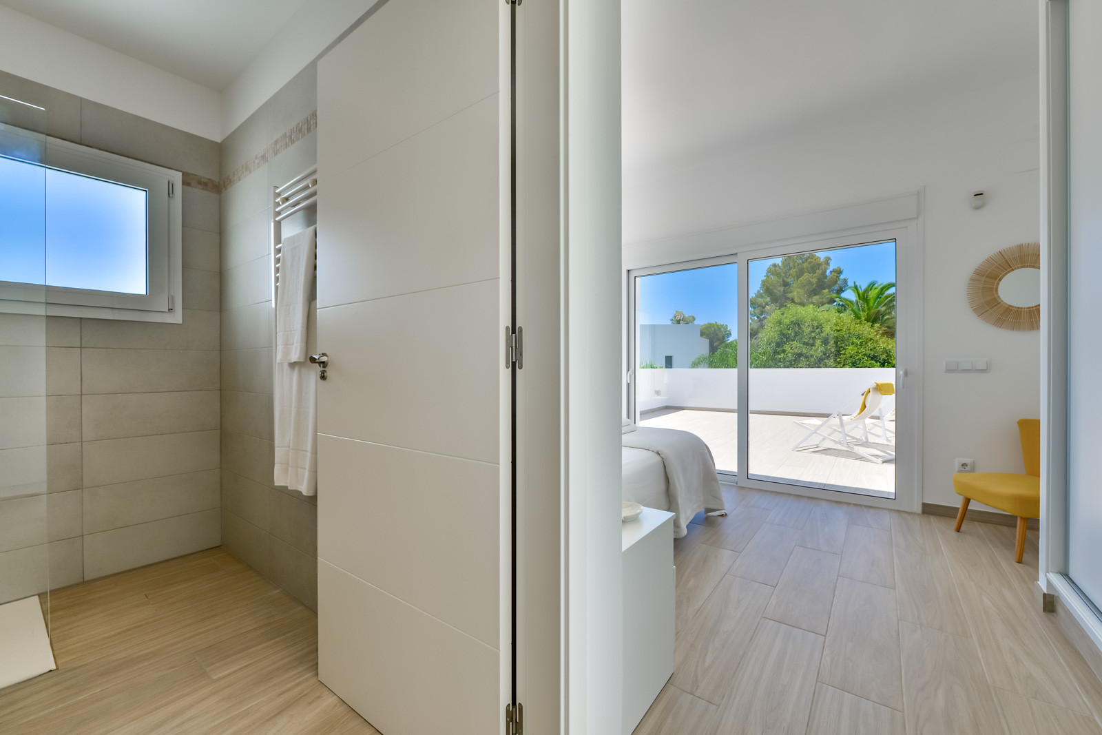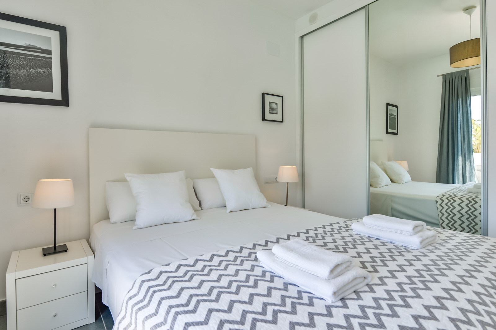 Im Hauptgeschoss finden wir einen Wohn-Essbereich mit Klimaanlage, eine zum Wohnbereich offene, moderne und komplett ausgestattete Küche, 1 Schlafzimmer mit Doppelbett und Klimaanlage, ein zweites Schlafzimmer mit zwei Doppelbetten und Klimaanlage, ein vollständiges Badezimmer mit Dusche und eine Gästetoilette. Ein Waschraum mit Waschmaschine, Trockner und Ausgang zur wunderschönen Terrasse.