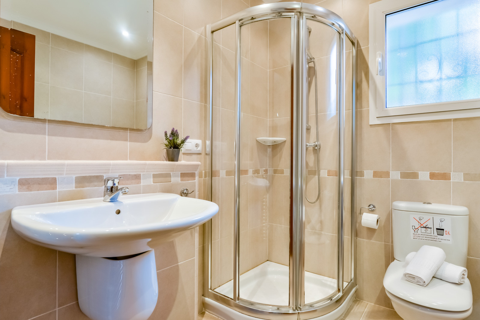 Im Erdgeschoss und durch eine Innentreppe vom Wohnzimmer verbunden, finden wire in Schlaffzimmer mit einem Doppelbett und ein drittes Schlafzimmer mit zeri Einzelbetten und ein komplettes Badezimmer mit Badewanne. Im flur darunter befindet sich eine Klimaanlage, die die beiden Räume im Untergeschoss bedient.