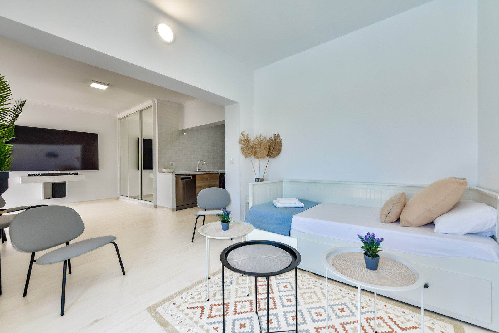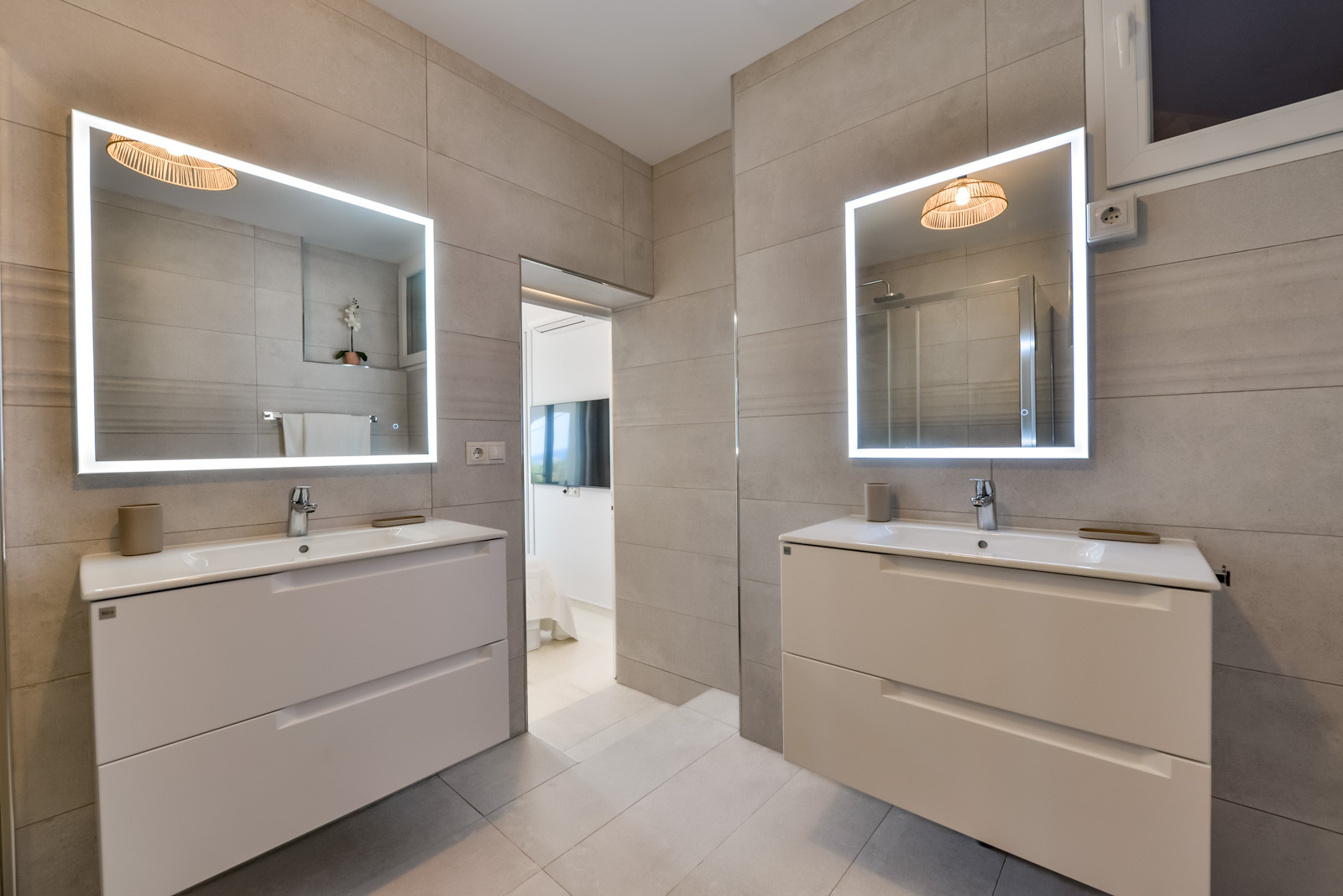 Die Villa verfügt über eine Hauptwohnung, zu der man eine Treppe hinuntergeht (die obere Wohnung bleibt geschlossen und leer) und besteht aus einem Schlafzimmer mit Doppelbett und Klimaanlage und einem Badezimmer en suite mit Dusche, einem Schlafzimmer mit Doppelbett und Klimaanlage und einem Badezimmer mit Dusche en suite, dem dritten Schlafzimmer mit Doppelbett, Badezimmer en suite mit Dusche und Klimaanlage. Offene Küche, ein Wohnzimmer mit Schlafsofa, Klimaanlage und Kamin, überdachte Terrasse, auf der Sie sowohl im Sommer als auch im Winter Familienmahle und -abendessen genießen können, mit einem wunderschönen Blick aufs Meer.