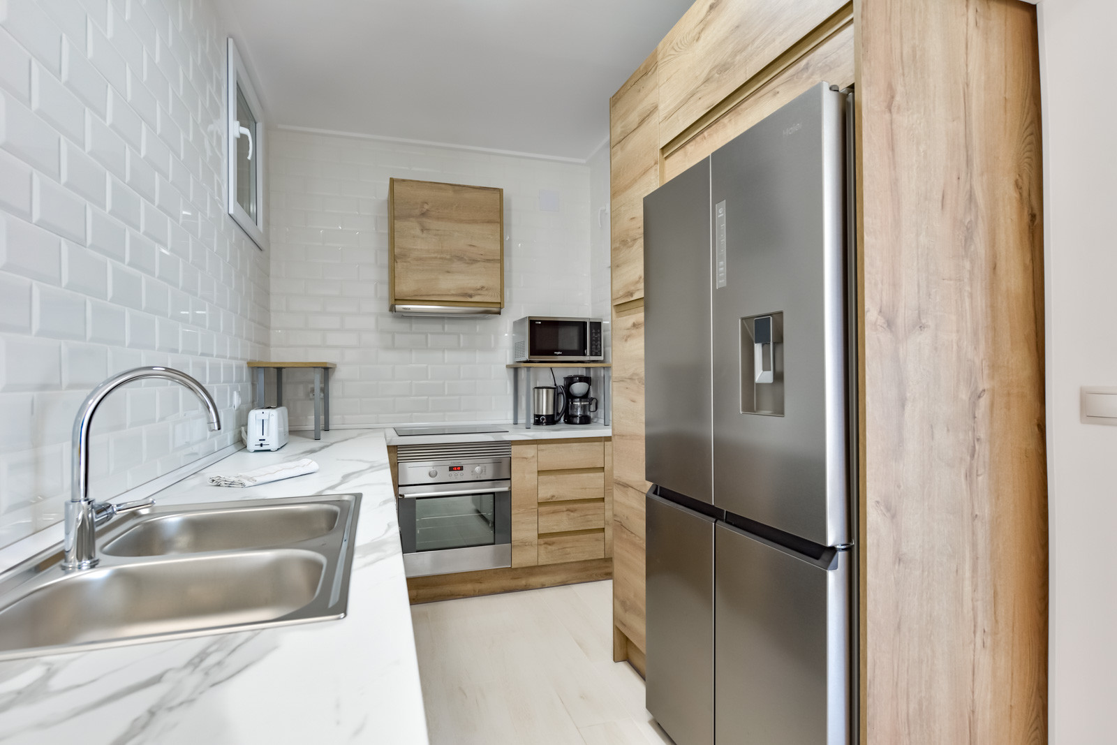 Die unabhängige Küche ist eine Induktionsküche und verfügt über einen Kühlschrank, eine Mikrowelle, einen Backofen, eine Gefriertruhe, eine Waschmaschine, einen Wäschetrockner, einen Geschirrspüler, Geschirr / Besteck, Küchenutensilien, eine Kaffeemaschine, einen Toaster und einen Wasserkocher.
