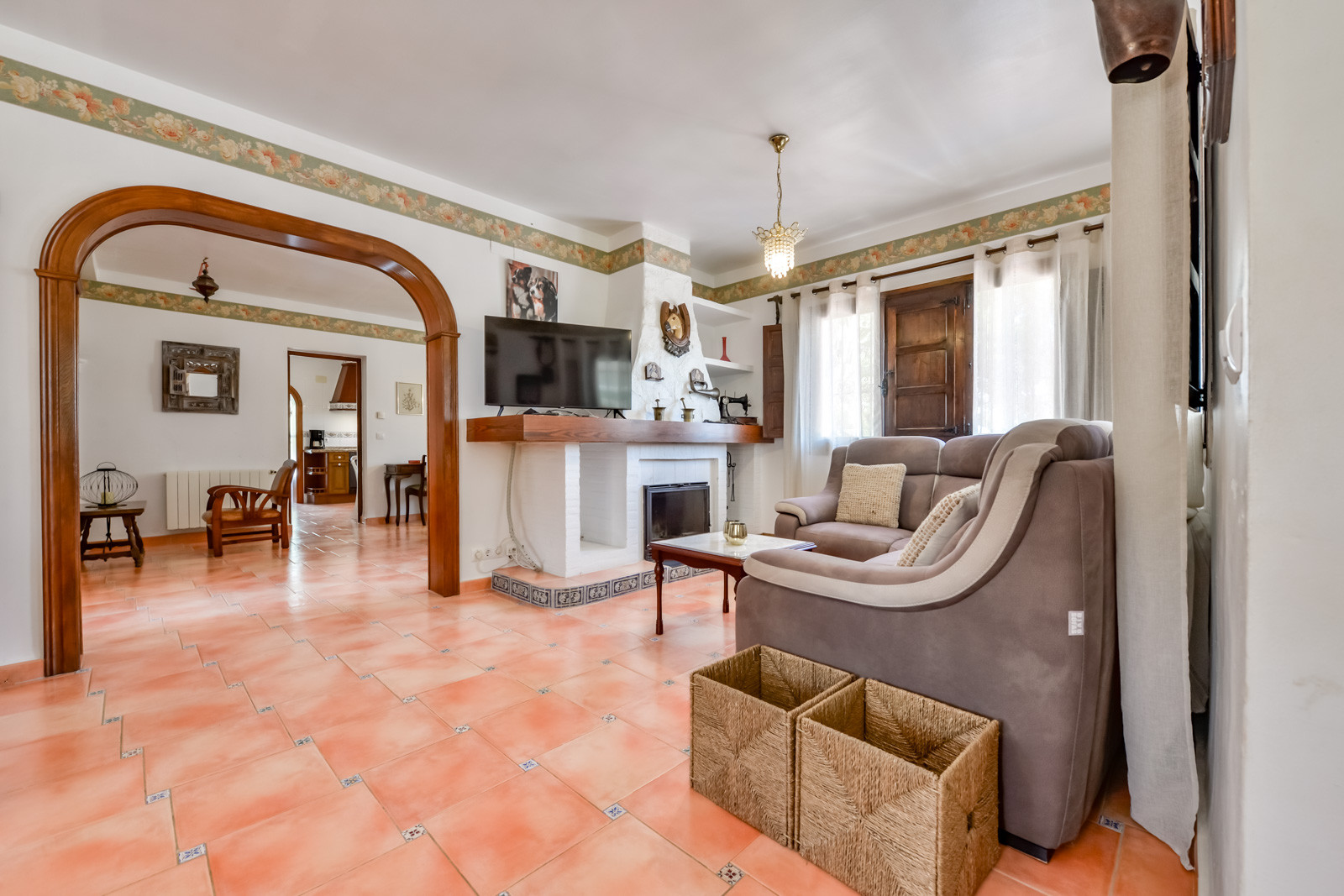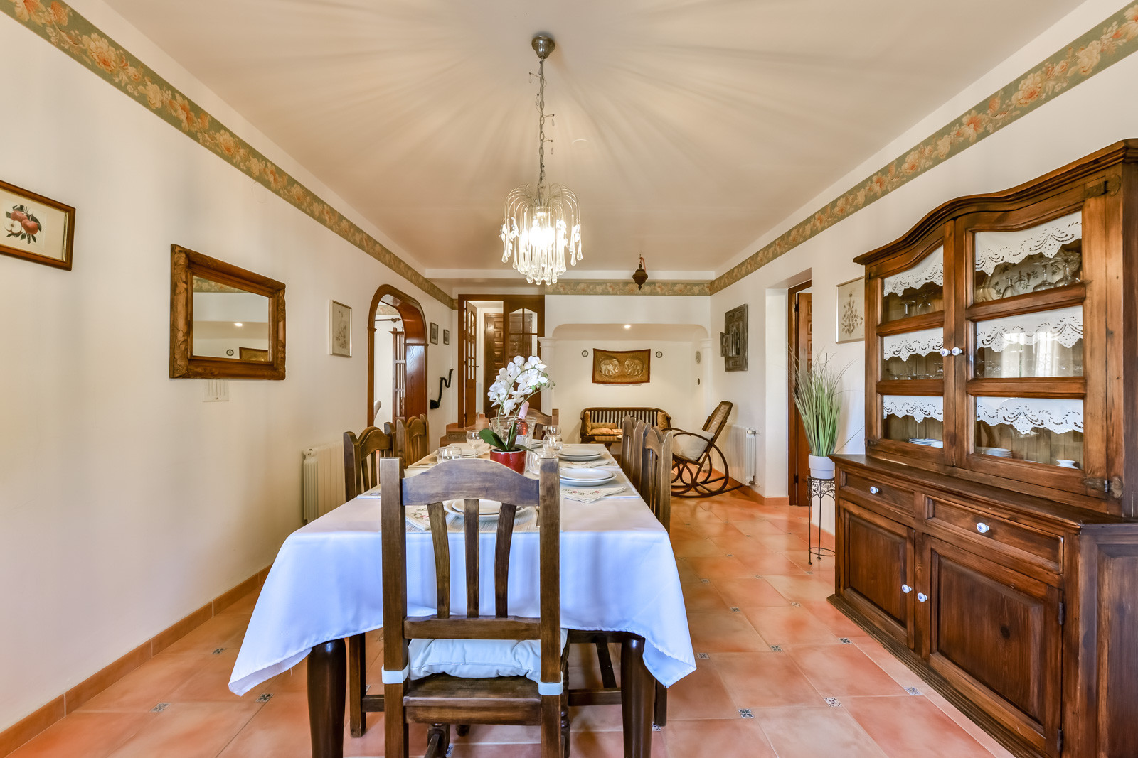 Mit 290 m2 Wohnfläche verteilt sich die Villa auf zwei Etagen, die durch eine Innentreppe verbunden sind. Im Erdgeschoss gibt es ein Esszimmer, das in zwei Räume unterteilt ist, ein Sofa, einen Fernseher und einen Holzkamin sowie einen Bereich mit einem Esstisch neben der voll ausgestatteten unabhängigen Küche, ein Badezimmer mit Dusche und eine verglaste Terrasse mit Aussicht zum Pool.