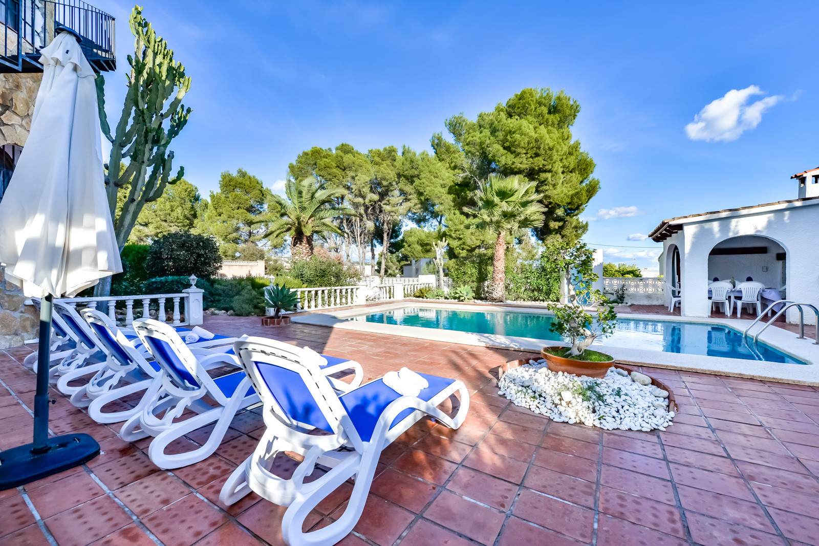 Mit 1.424 m2 Grundstücksfläche verfügt die Villa über mehrere Terrassen und ein Gästezimmer gegenüber des Pools mit Doppelbett, Klimaanlage und einem vollständigen Badezimmer mit Dusche. Ein Pool mit gemauerten Treppen zum Einstieg und eine Liegezonefür Sonnenbäder. Die Villa verfügt über 3 Parkplätze innerhalb des Grundstücks und eine Gasgrillfläche zum Kochen im Freien.