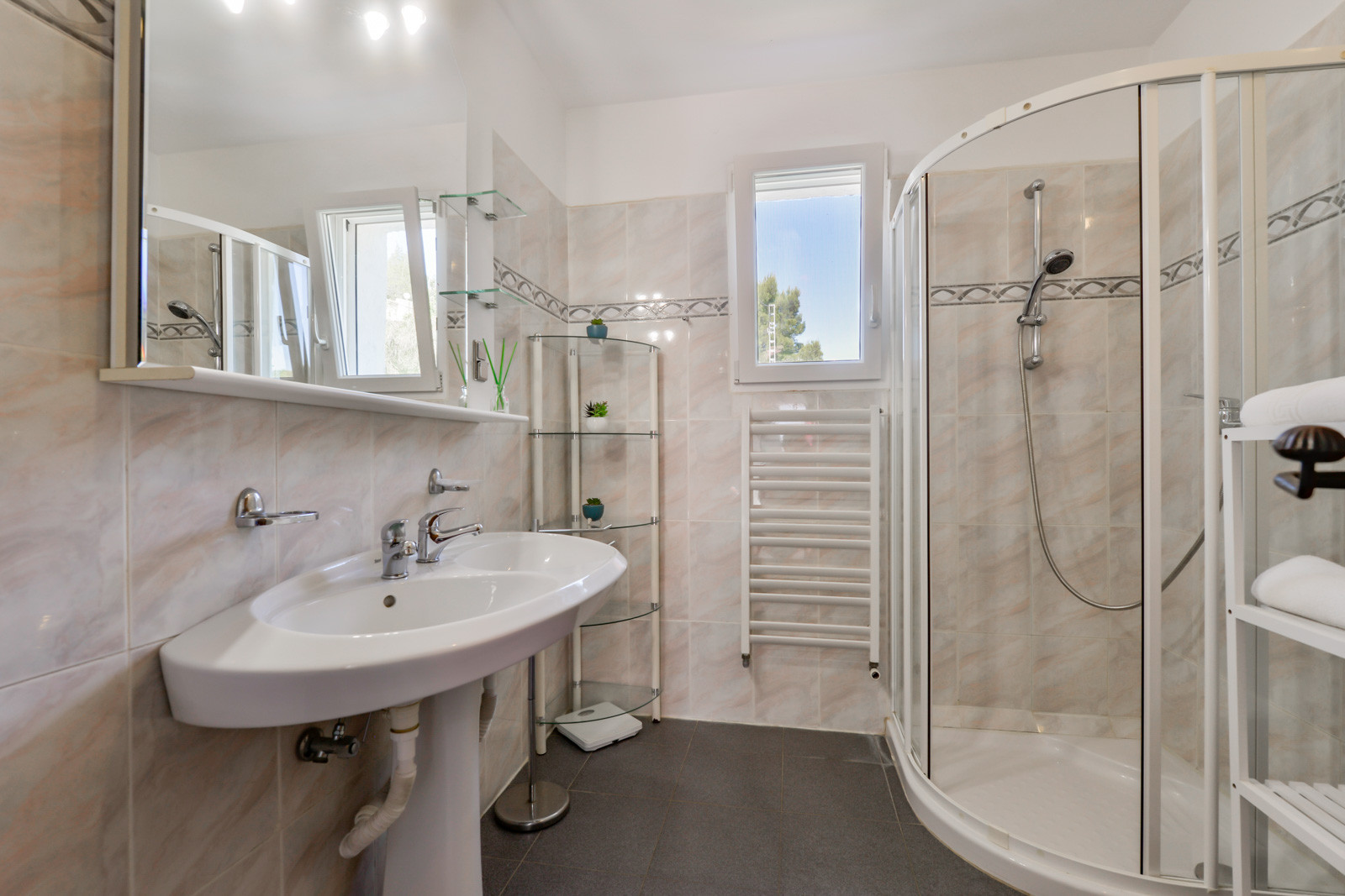 Im Erdgeschoss und durch eine Innentreppe vom Wohnzimmer verbunden, finden wire in Schlaffzimmer mit einem Doppelbett und ein drittes Schlafzimmer mit zeri Einzelbetten und ein komplettes Badezimmer mit Badewanne. Im flur darunter befindet sich eine Klimaanlage, die die beiden Räume im Untergeschoss bedient.
