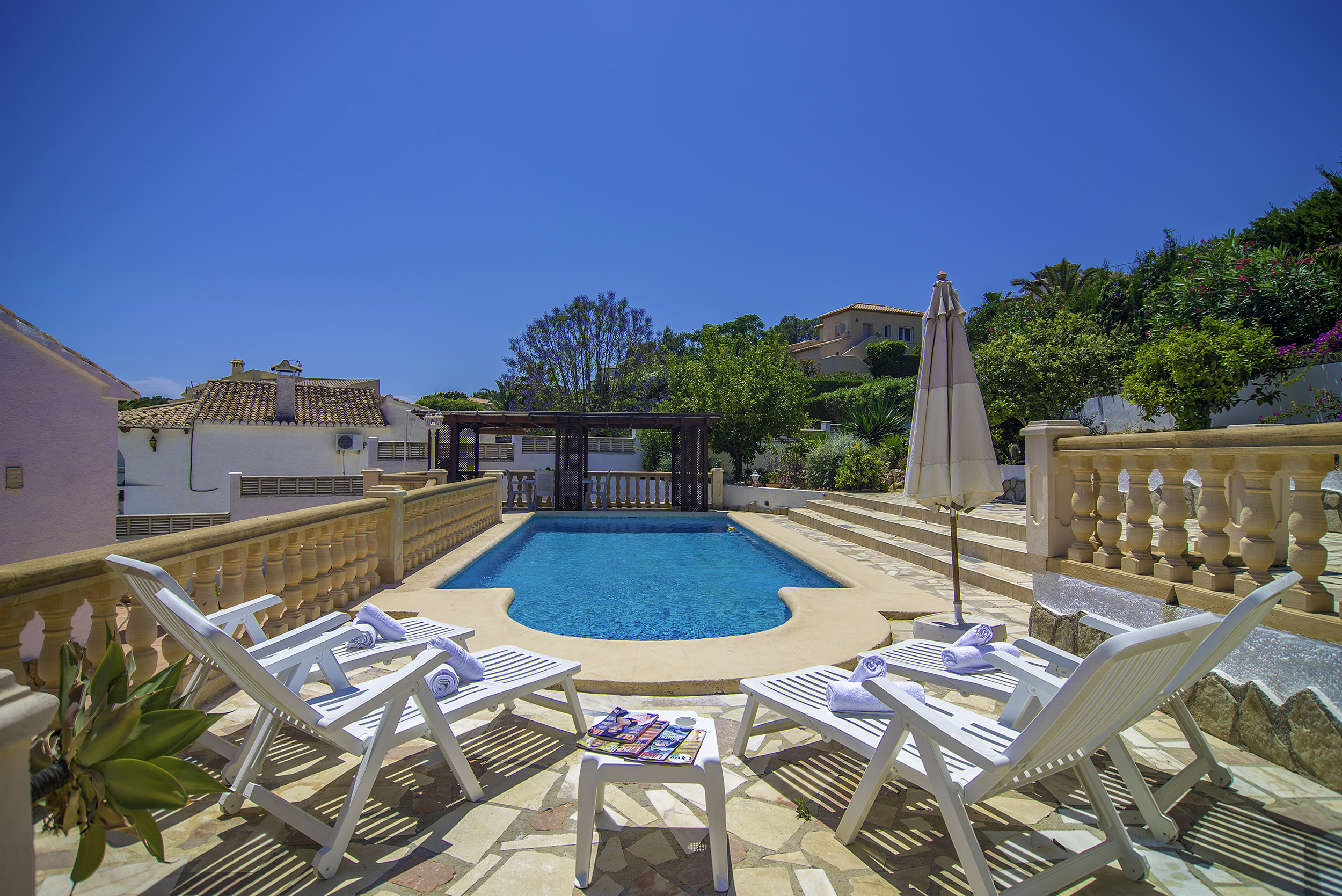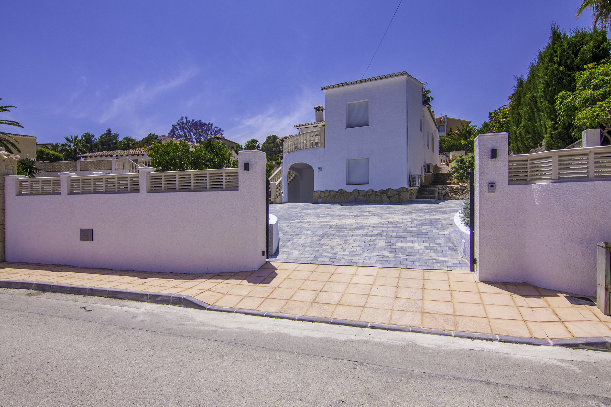 Mit 760m2 Grundstück. Der Eingang zum Grundstück verfügt über ein Elektrisches Tor, das zu einem Parkplatz für mehrere Autos führt, eine Treppe, die zum Haupthaus führt, und eine kleine zweite Treppe für den Zugang zum Pool. Im Poolbereich gibt es Hängematten zum Sonnenbaden und eine Pergola mis Esstisch und Grill.