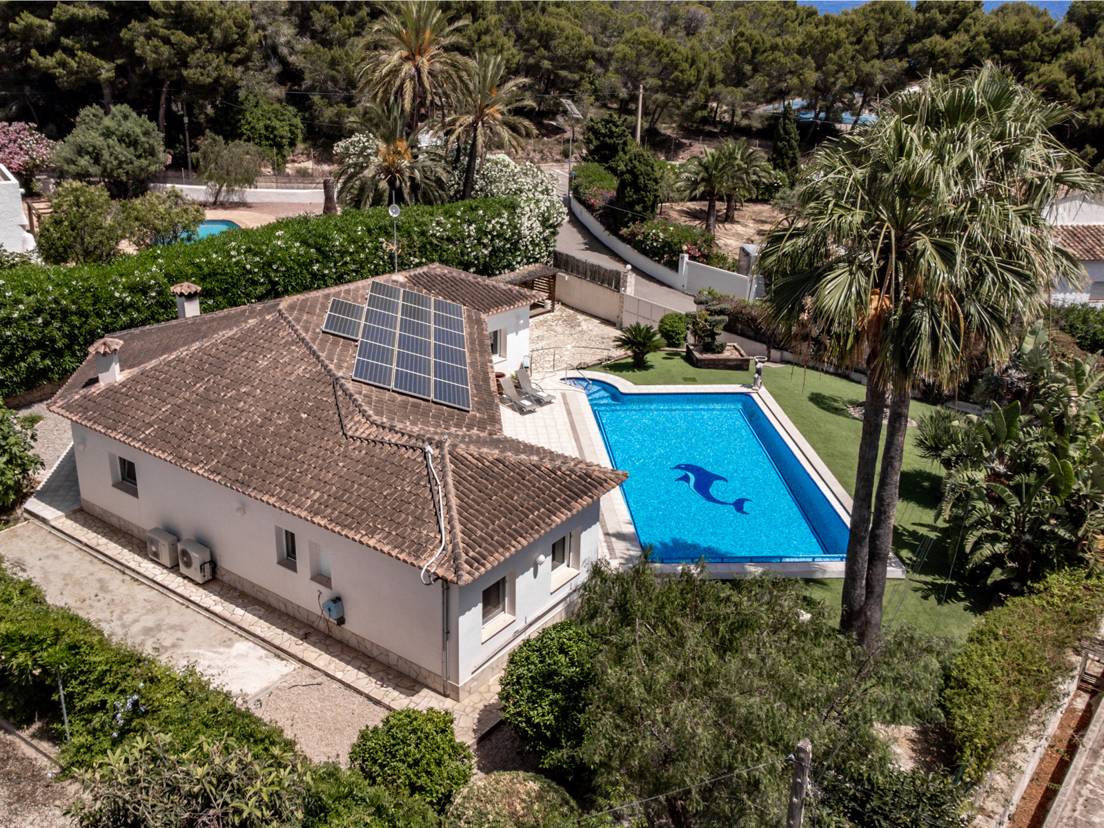 Mit einer Einfahrt für Autos und Platz für zwei Fahrzeuge im Inneren des Grundstücks sowie einer privaten Poolzone mit Sonnenliegen und überdachter Terrasse zum ganzjährigen Genuss.