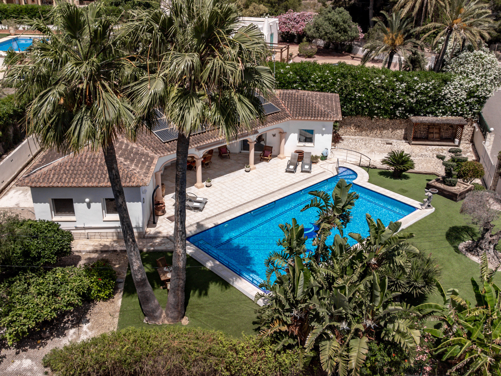Das Grundstück bietet Platz für mehrere Fahrzeuge im innen- und Aussenbereich. Vor der Terrasse mit blick auf das Wohnzimmer, die überdacht ist, finden wir den Pool mit eingebauten Treppen zum Innenraum, eine Dusche und einen Hängemattenbereich zum Sonnenbaden. Wenn wir einige Stufen hinuntergehen, gelangen wir zu einem Gartenbereich mit Grill und einem Tisch mit Steinbänken, auf denen man Draussen essen kann.