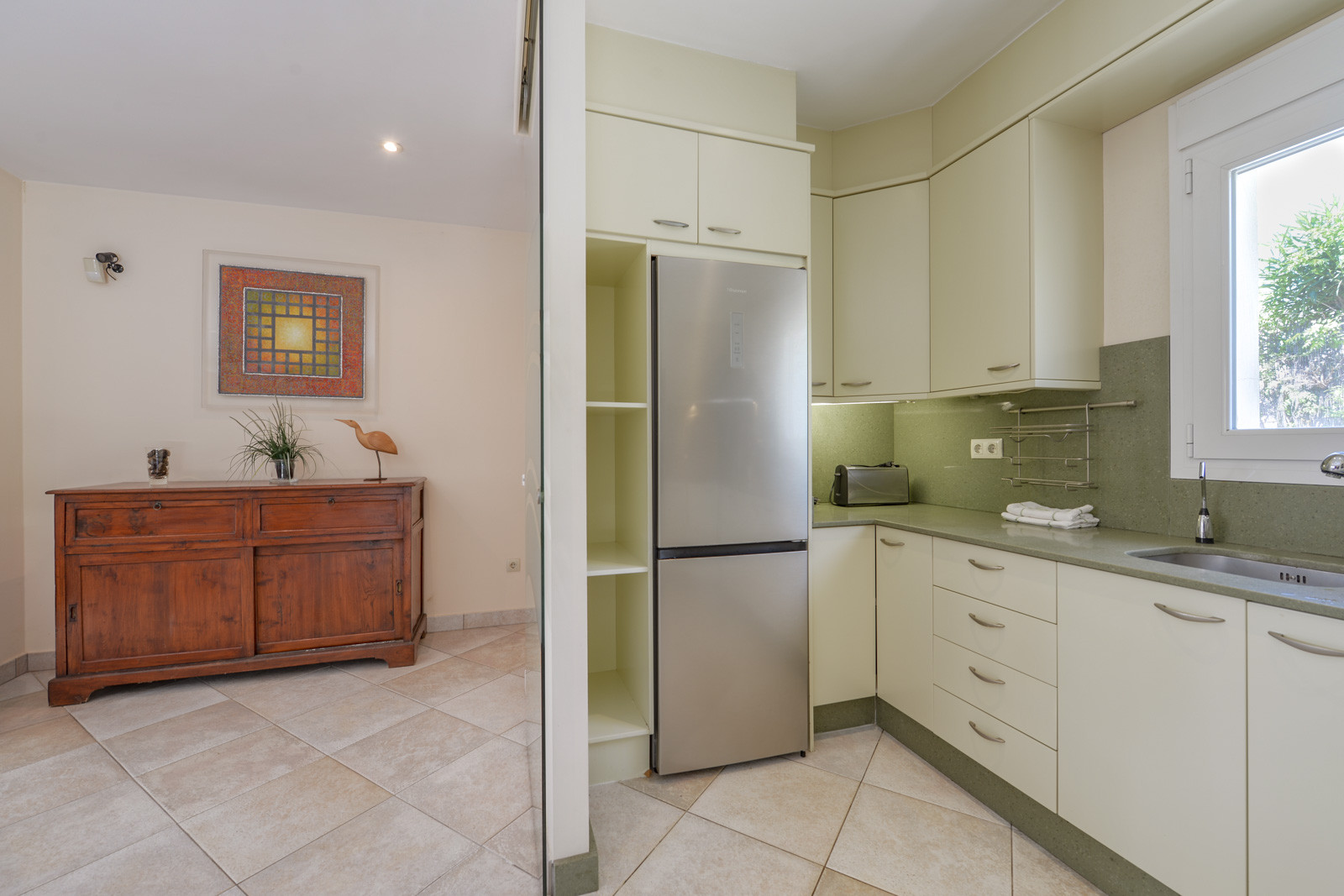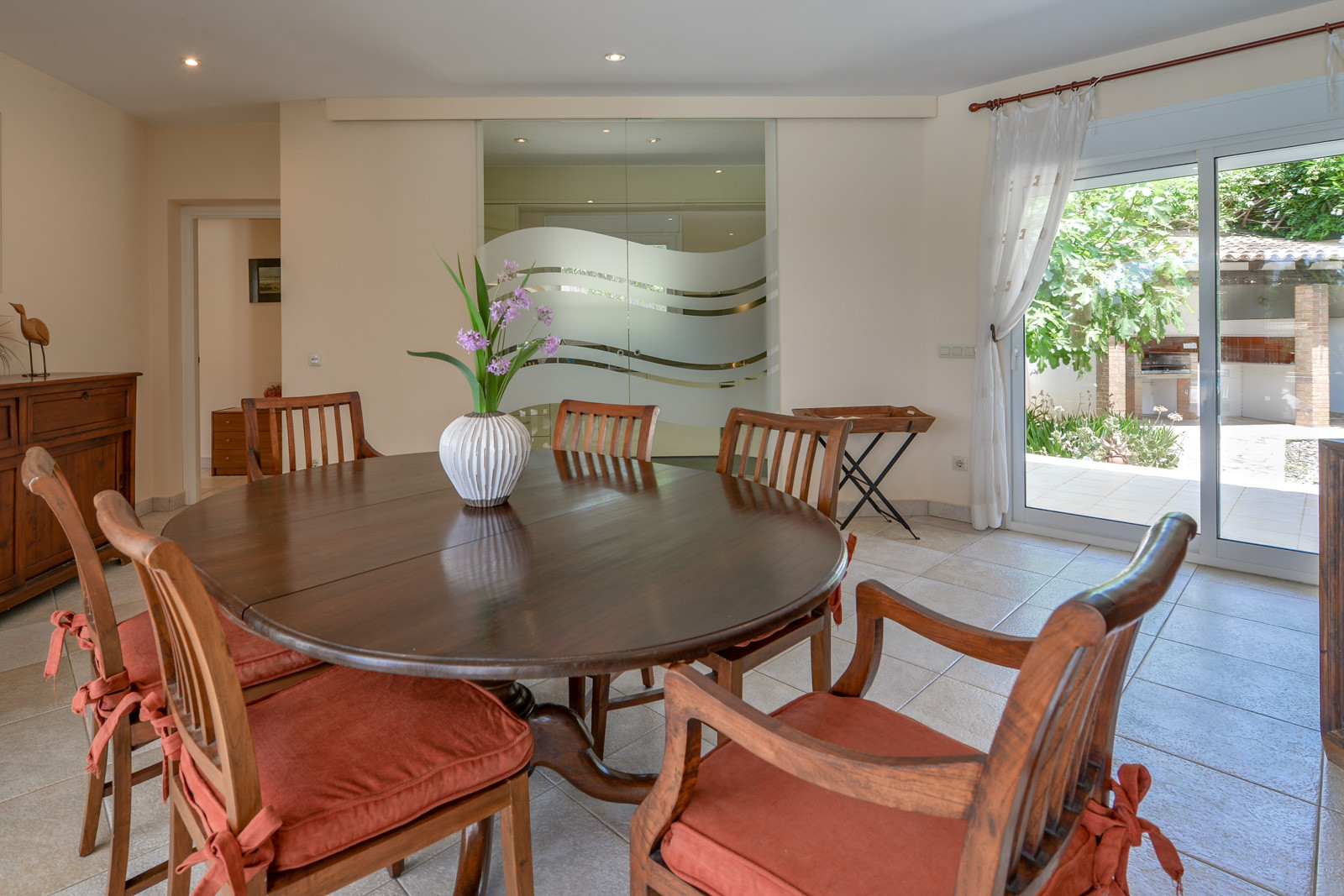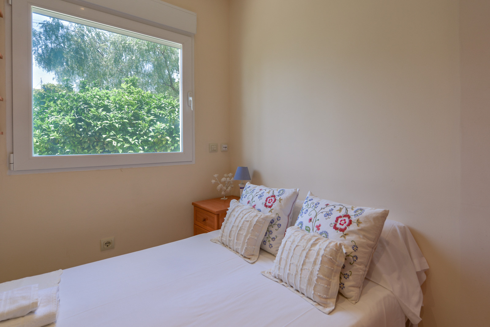 Mit 150 m2 Wohnfläche verteilt sich die Villa auf eine einzige Etage, die durch den schönen Garten zugänglich ist. Im Inneren befindet sich ein angenehmes Wohn- und Esszimmer mit einem runden Tisch für 6 Personen, einem Sofabereich, einem TV, einer Klimaanlage und einer zum Wohnzimmer offenen Küche, die durch originale Glastüren getrennt werden kann. Auf einer Seite des Wohnzimmers befindet sich ein großes Schlafzimmer mit einem Doppelbett, einer Klimaanlage, einem eigenen Badezimmer mit Dusche und Badewanne sowie einem Bereich für den Kleiderschrank und Zugang zur Terrasse. Am anderen Ende des Hauses finden wir ein komplettes Badezimmer mit Badewanne, ein Zimmer mit einem Einzelbett und Klimaanlage, ein Zimmer mit zwei Einzelbetten zusammen und Klimaanlage, ein kleines WC mit Waschbecken und das vierte Zimmer mit einem Einzelbett und Klimaanlage.