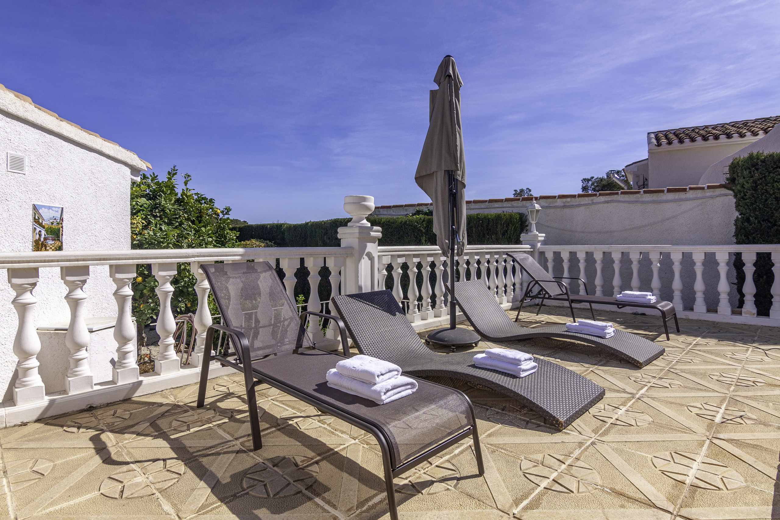 Die Villa verfügt über 120 m2 Wohnfläche und ist auf einer einzigen Etage verteilt. Das erste, was wir finden, ist eine kleine verglaste Terrasse mit viel natürlichem Licht, ein amerikanischer Kühlschrank mit zwei Türen, und durch einen Bogen verbunden, finden wir das Wohnzimmer mit einem Sofa, TV-Bereich und Tisch für Mittag-und Abendessen, ein Schlafzimmer mit Doppelbett von 135, ein zweites Schlafzimmer mit Doppelbett (zwei Einzelbetten zusammen), das dritte Schlafzimmer hat auch zwei einzelne Matratzen zusammen. Ein komplettes Badezimmer mit Badewanne, eine kleine, aber gut ausgestattete Küche und eine zentrale Klimaanlage im ganzen Haus. Von der Eingangshalle und neu gebaut, finden wir ein komplettes Bad mit Dusche und einen Zugang zum vierten Schlafzimmer, mit Doppelbett und großen Fenstern mit Zugang zum Pool und Terrasse Bereich.