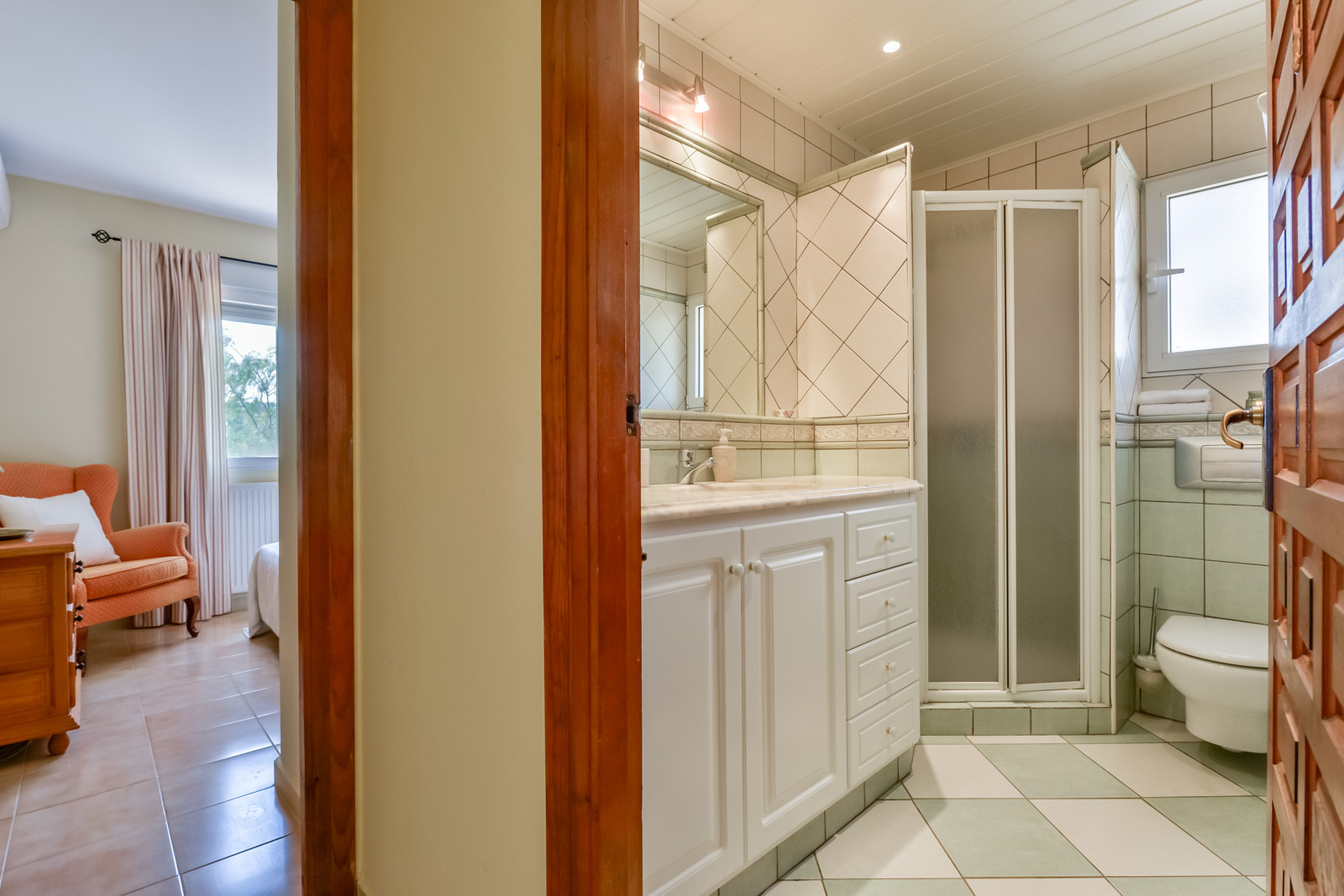 Mit 90 m² Wohnfläche verteilt sich die Villa Junai auf einer einzigen Etage (die obere Etage, die auf dem Foto zu sehen ist, ist geschlossen und leer), mit einem Doppelzimmer, einem Badezimmer mit Badewanne, einem zweiten Doppelzimmer, einem kleinen Wohn-Esszimmer mit Klimaanlage, offener Küche und Ausgang zur Terrasse und Grillbereich.