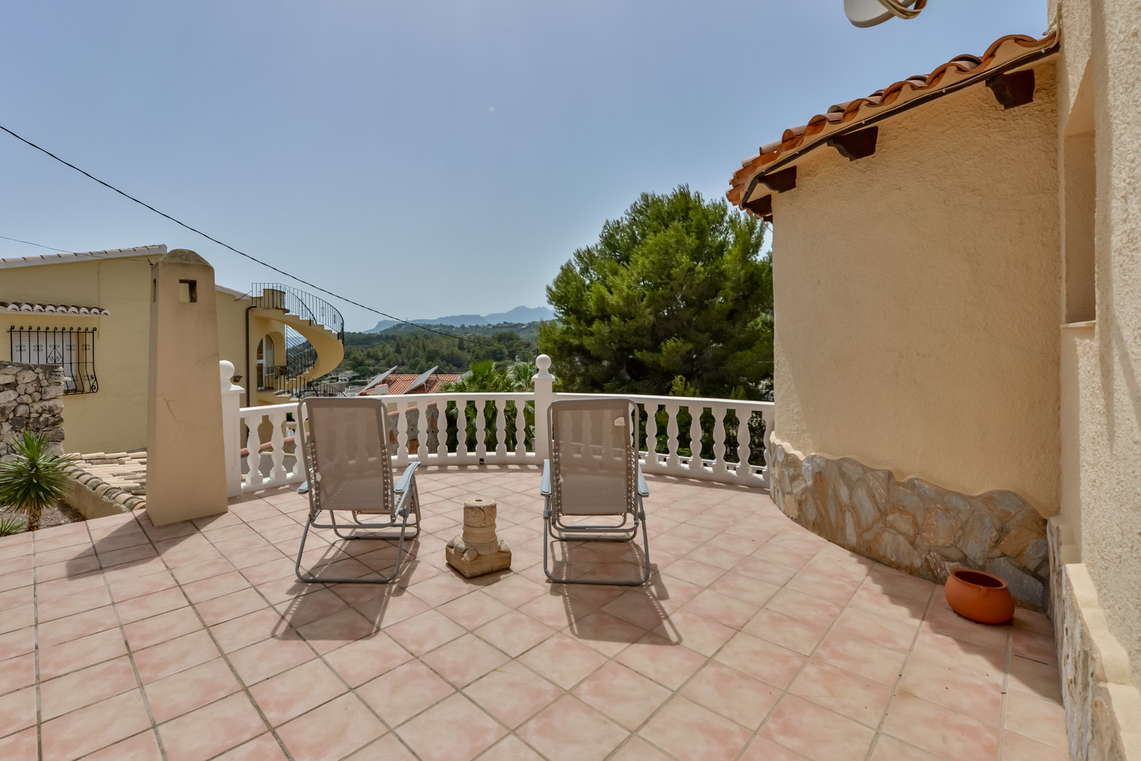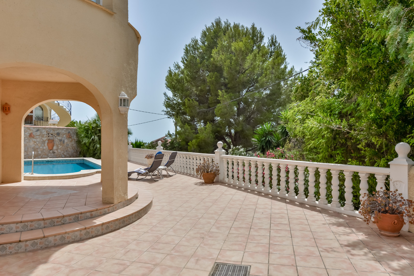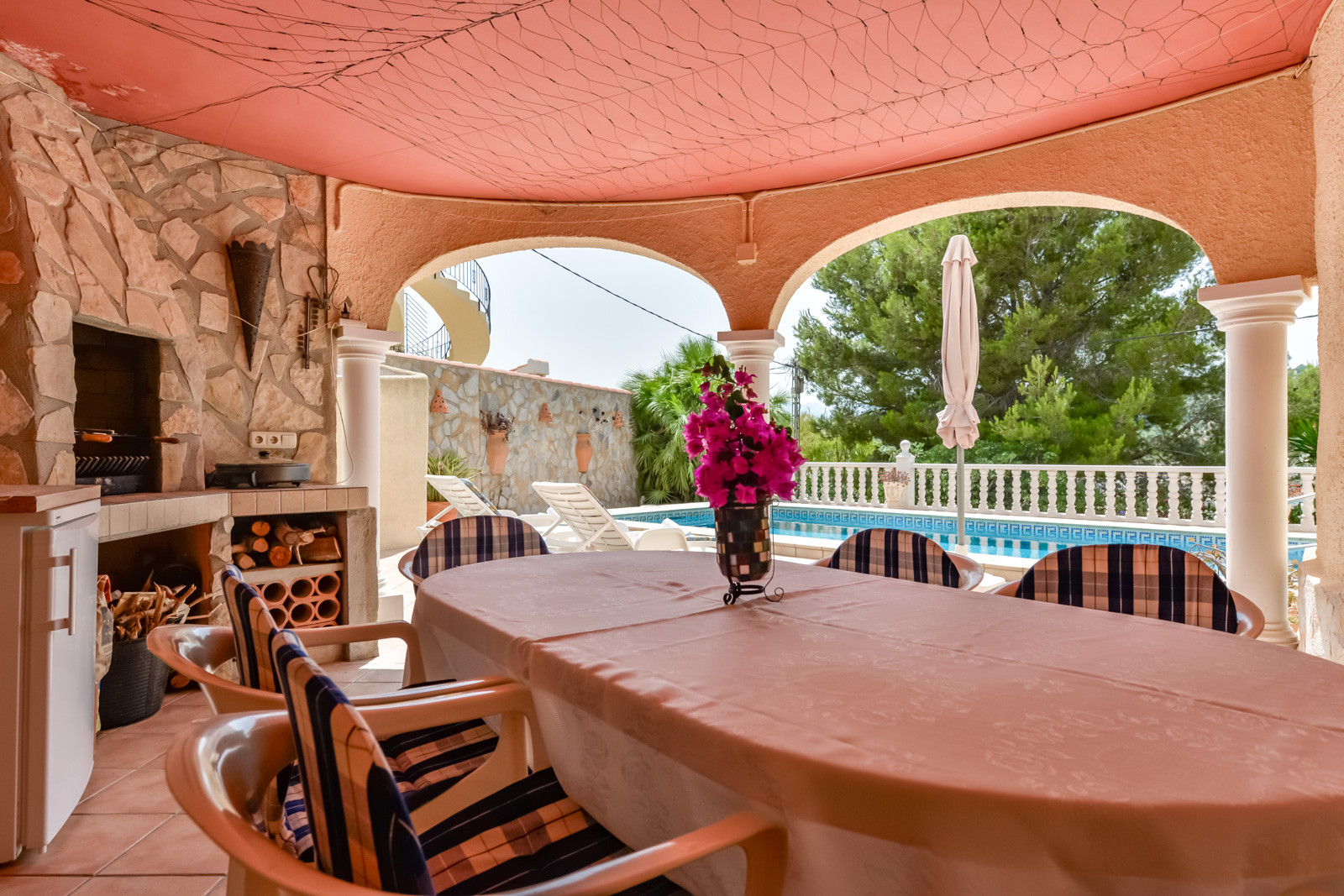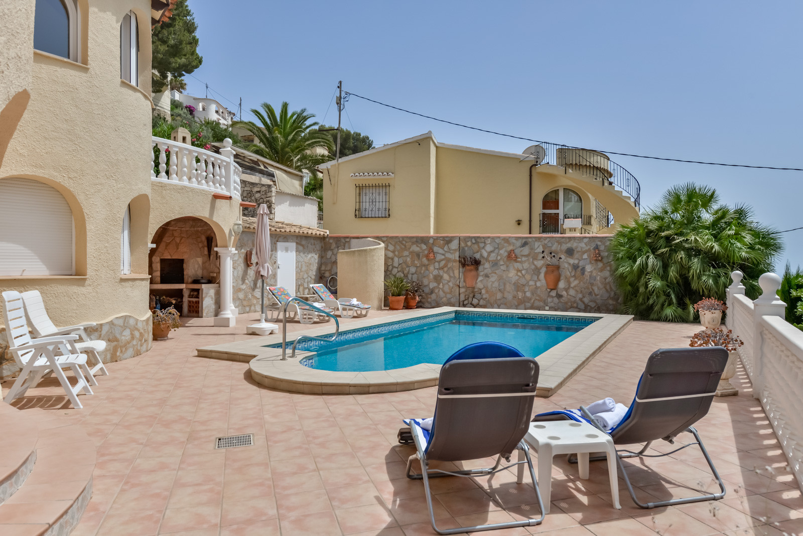 Die Villa Mirasol verfügt über angenehme Außenbereiche mit Terrassen und einen Swimmingpool mit gemauerten Treppen und einem Metallgeländer, das den Zugang zum Pool erleichtert, um ins Innere zu gelangen. Der Poolbereich ist über eine Außentreppe vom Hauptgeschoss aus zu erreichen und verfügt über eine Außendusche, Sonnenliegen zum Sonnenbaden und einen schönen überdachten Grillplatz mit einem Tisch zum Essen und Trinken am Pool.