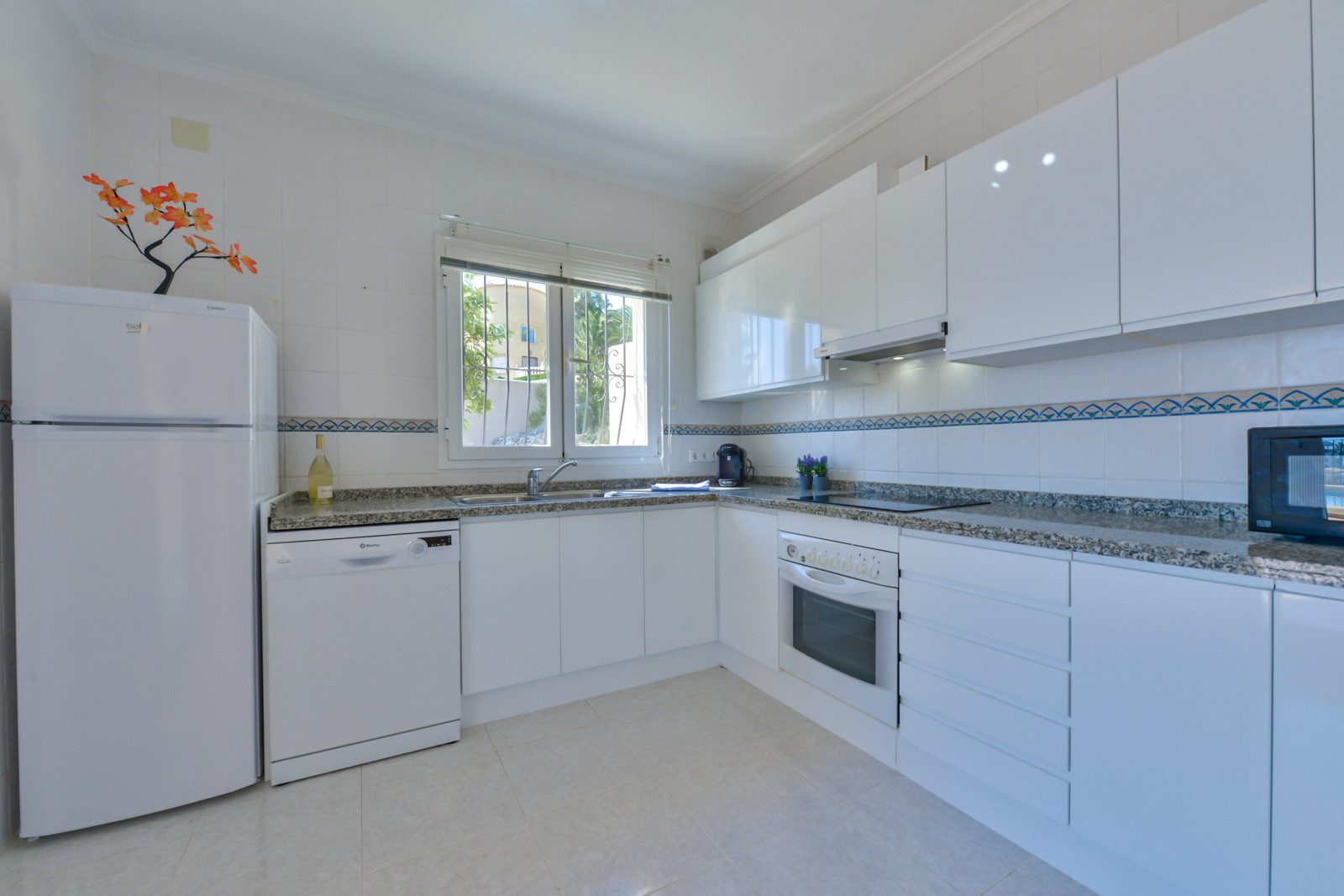 In der offenen Küche mit Glaskeramik sind Kühlschrank, Mikrowelle, Backofen, Gefrierschrank, Waschmaschine, Spülmaschine, Geschirr/Besteck, Küchenutensilien, Kaffeemaschine, Toaster, Wasserkocher und Saftpresse vorhanden.