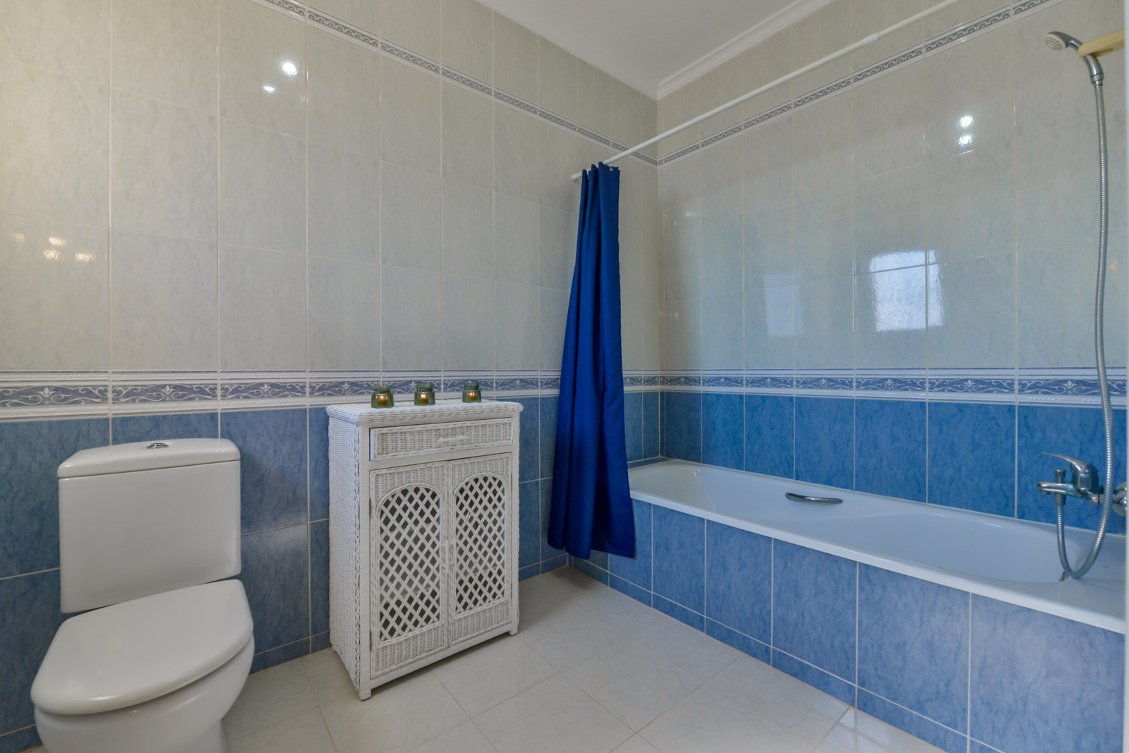 Die 145 m² große Villa erstreckt sich über zwei Etagen, die im Inneren durch eine Treppe mit 8 Stufen verbunden sind. Im ersten Stock, der über zwei Stufen zu erreichen ist, befinden sich ein Badezimmer mit Dusche, ein Schlafzimmer mit zwei Einzelbetten und Klimaanlage, ein zweites Schlafzimmer mit Doppelbett und Klimaanlage. Eine voll ausgestattete Küche mit Geschirrspüler, ein Wohnzimmer mit dekorativen Kamin und Klimaanlage. Über die Innentreppe gelangt man in das Obergeschoss, in dem sich ein Schlafzimmer mit Doppelbett, Klimaanlage und eigenem Bad mit Badewanne befindet.