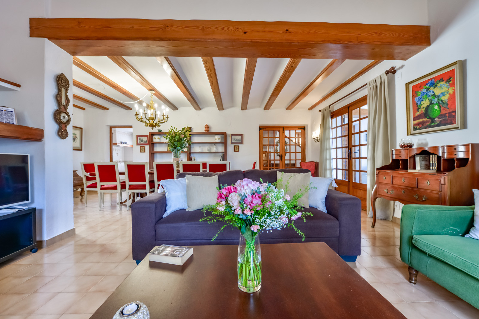 Mit 150 m² Wohnfläche und mit einer typisch spanischen mediterranen Dekoration, ist die Villa wie folgt aufgeteilt: Ein Hauptgeschoss mit einer geräumigen, voll ausgestatteten und unabhängigen Küche. Von der Küche aus hat man Zugang zu einem der Schlafzimmer mit einem Einzelbett und einem eigenen Bad mit einer kleinen Badewanne. Ein geräumiges Wohn-/Esszimmer mit dekorativem Kamin, Klimaanlage, einer Sofaecke und einem Essbereich. Vom Wohnzimmer aus hat man Zugang zum zweiten Einzelzimmer mit einem 90/190cm Bett. Vom Wohnzimmer aus führt ein Flur zu einer Gästetoilette mit WC und Waschbecken, einem dritten Schlafzimmer mit Doppelbett und einem Bad mit Dusche.