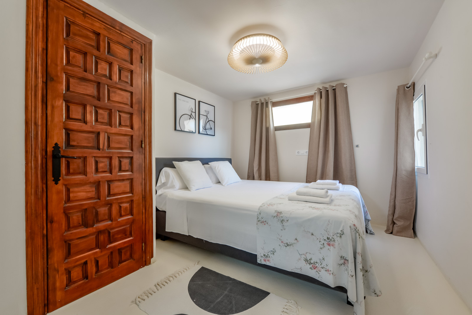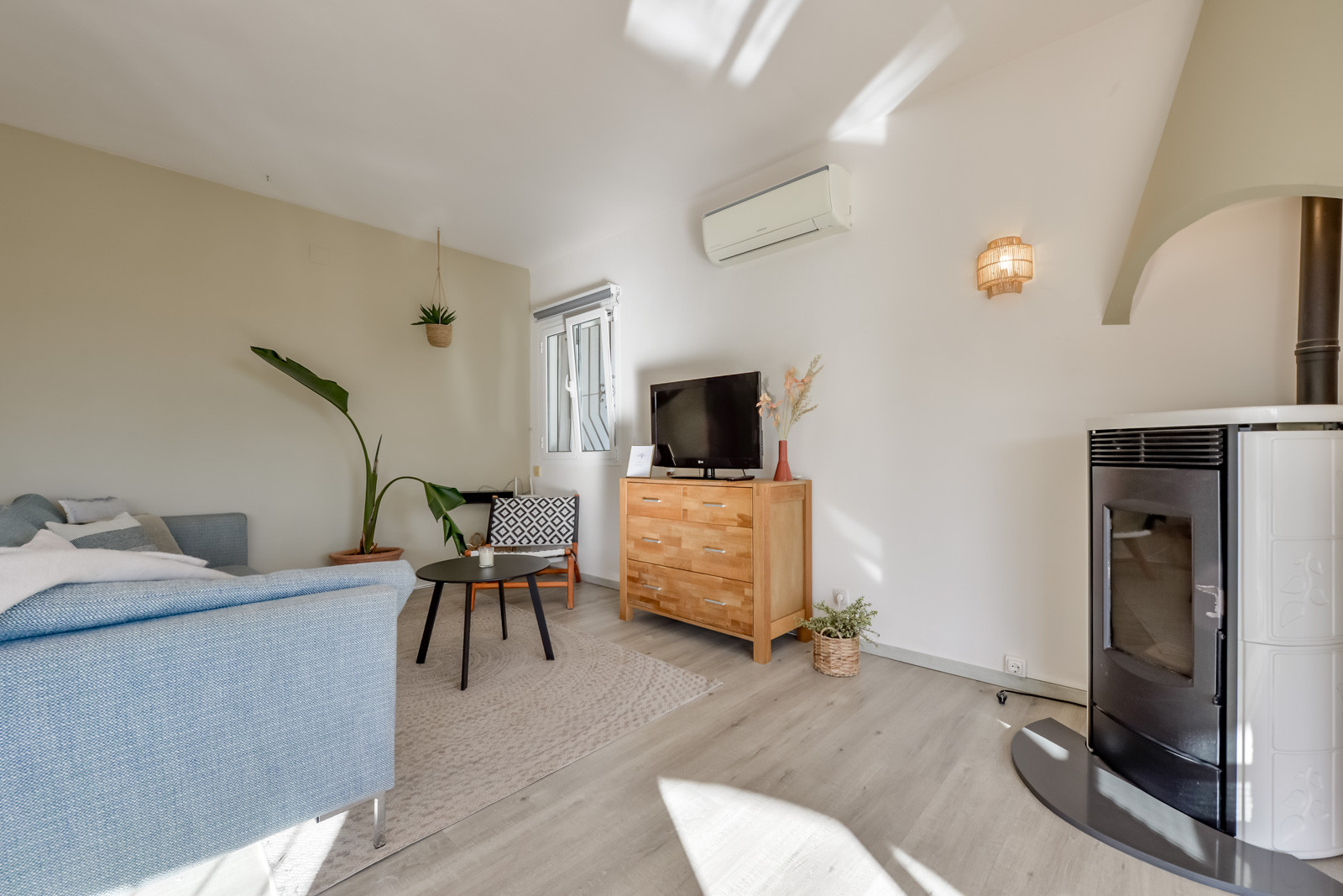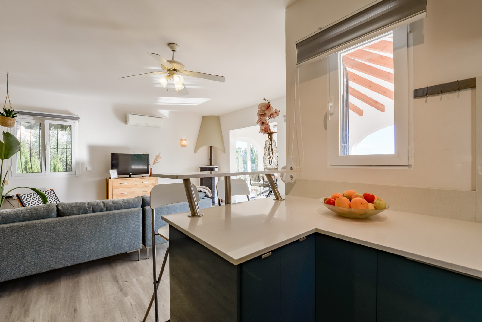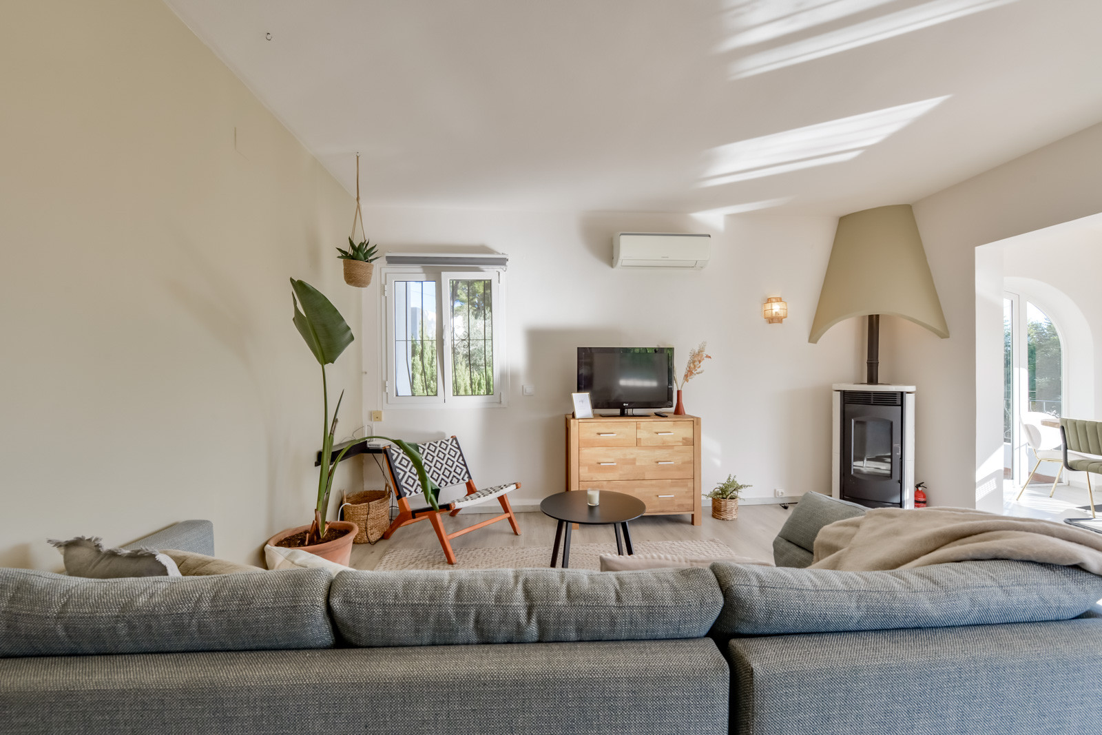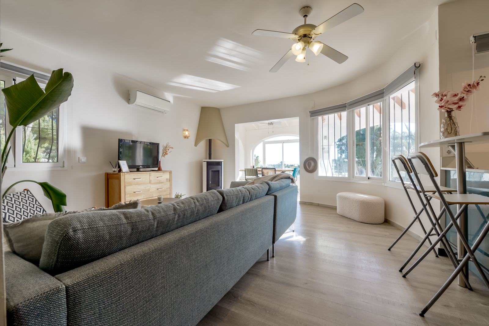 Mit 150 m² Wohnfläche und mit einer typisch spanischen mediterranen Dekoration, ist die Villa wie folgt aufgeteilt: Ein Hauptgeschoss mit einer geräumigen, voll ausgestatteten und unabhängigen Küche. Von der Küche aus hat man Zugang zu einem der Schlafzimmer mit einem Einzelbett und einem eigenen Bad mit einer kleinen Badewanne. Ein geräumiges Wohn-/Esszimmer mit dekorativem Kamin, Klimaanlage, einer Sofaecke und einem Essbereich. Vom Wohnzimmer aus hat man Zugang zum zweiten Einzelzimmer mit einem 90/190cm Bett. Vom Wohnzimmer aus führt ein Flur zu einer Gästetoilette mit WC und Waschbecken, einem dritten Schlafzimmer mit Doppelbett und einem Bad mit Dusche.