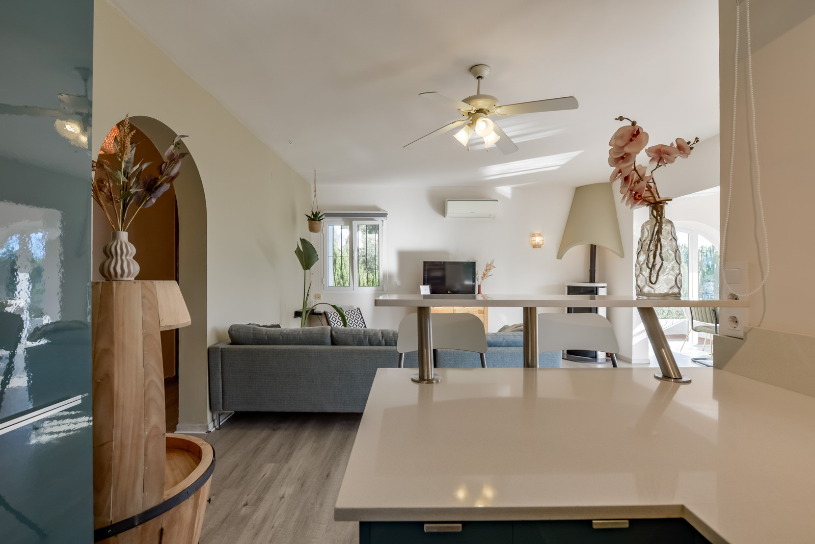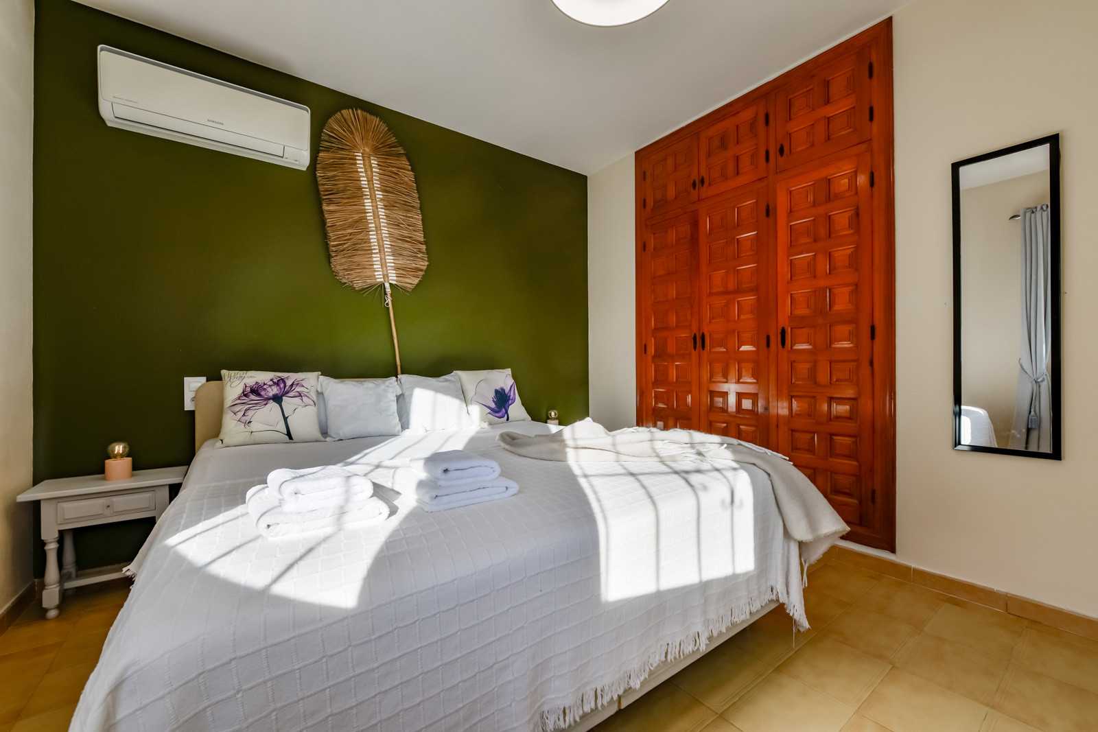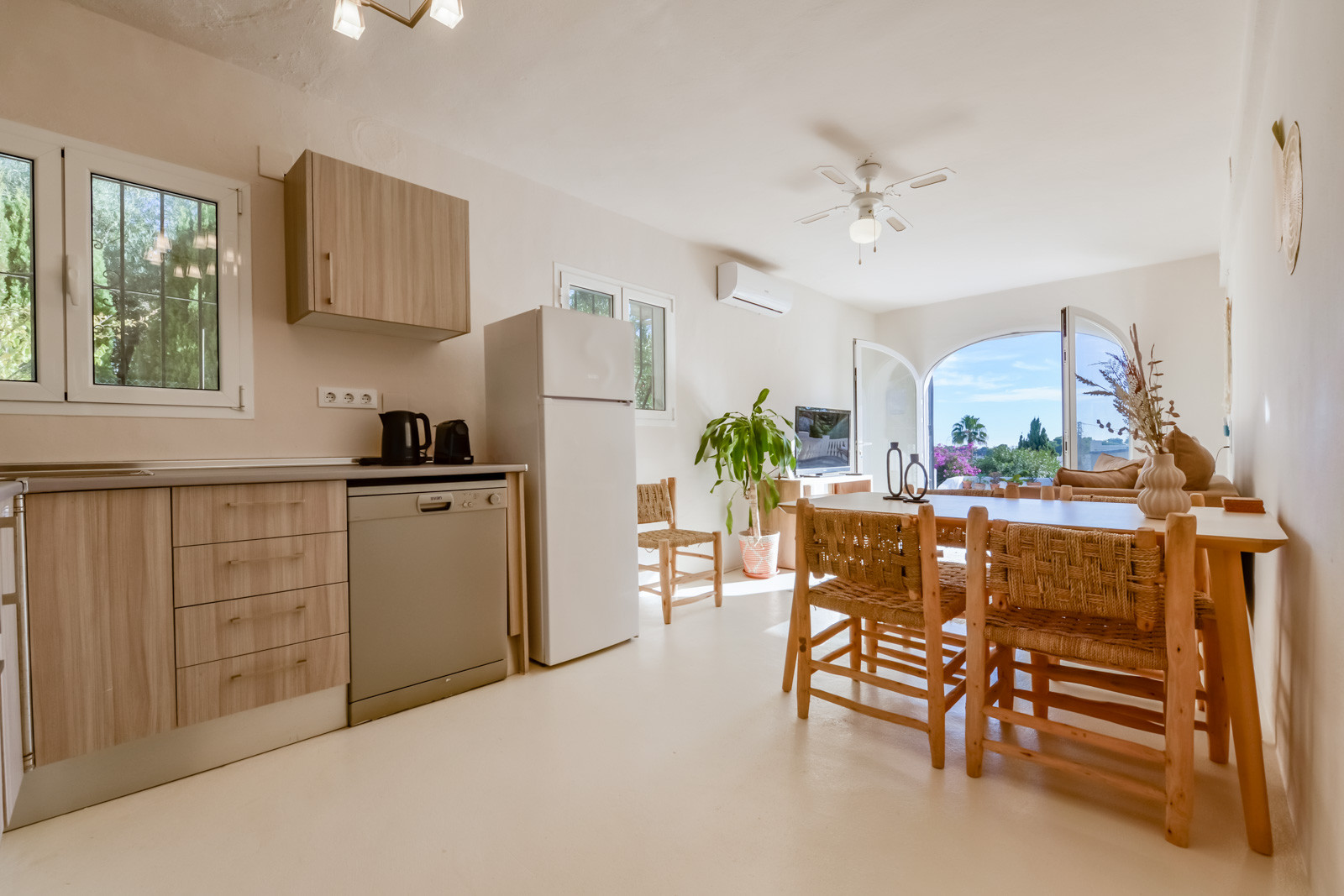 Im Erdgeschoss finden Sie ein Schlafzimmer mit zwei 80cm/200cm Boxspringbetten und Deckenventilator, ein weiteres Schlafzimmer mit einem 90cm/190cm Boxspringbett und Deckenventilator, ein drittes Schlafzimmer mit Doppel-Boxspringbett (2 untrennbare 80cm/200cm Matratzen), Deckenventilator und en-suite Badezimmer mit Regendusche, Wohnzimmer mit Klimaanlage und einem zweiten Fernseher mit Chromecast für mehr Unterhaltungsmöglichkeiten, Esstisch für sechs Personen, eine weitere voll ausgestattete Gasküche mit Backofen, Geschirrspüler, Kühl- und Gefrierschrank und ein Badezimmer mit begehbarer Regendusche.