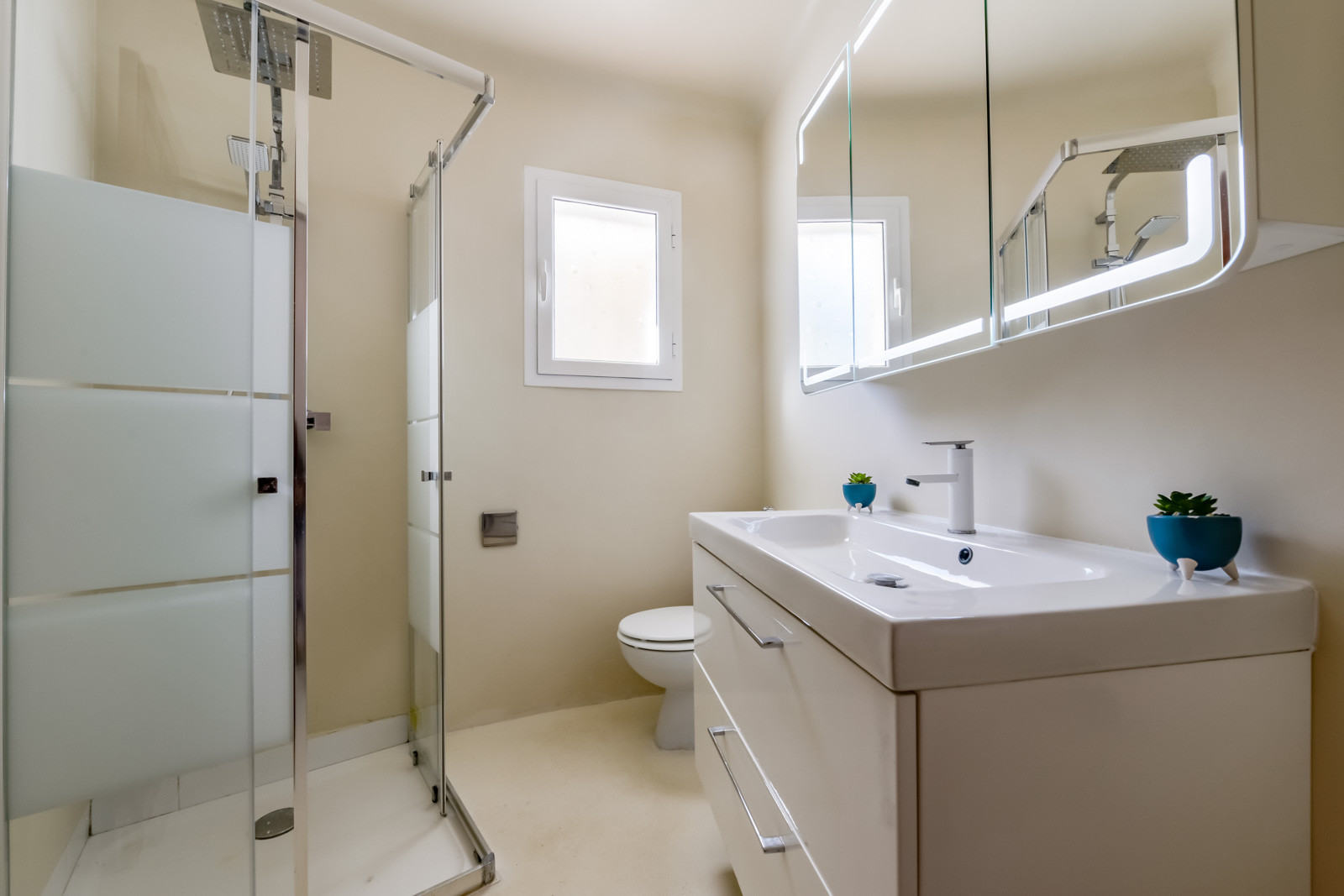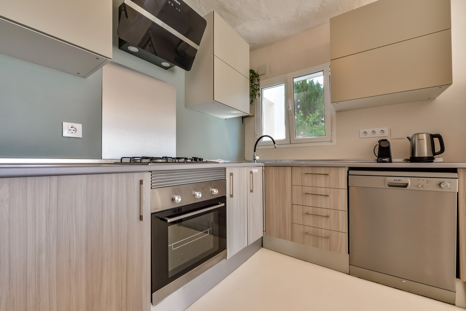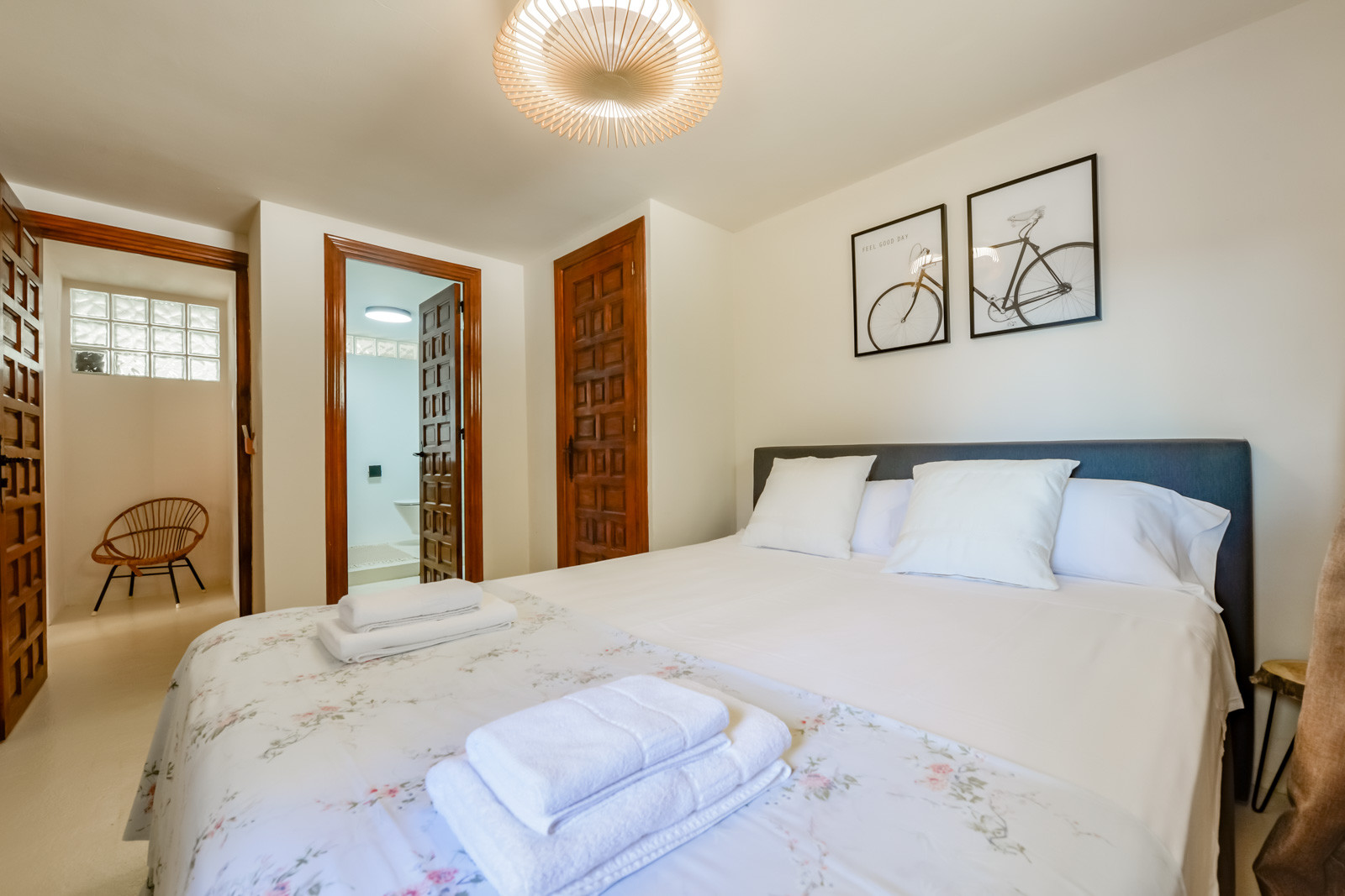 Im Erdgeschoss finden Sie ein Schlafzimmer mit zwei 80cm/200cm Boxspringbetten und Deckenventilator, ein weiteres Schlafzimmer mit einem 90cm/190cm Boxspringbett und Deckenventilator, ein drittes Schlafzimmer mit Doppel-Boxspringbett (2 untrennbare 80cm/200cm Matratzen), Deckenventilator und en-suite Badezimmer mit Regendusche, Wohnzimmer mit Klimaanlage und einem zweiten Fernseher mit Chromecast für mehr Unterhaltungsmöglichkeiten, Esstisch für sechs Personen, eine weitere voll ausgestattete Gasküche mit Backofen, Geschirrspüler, Kühl- und Gefrierschrank und ein Badezimmer mit begehbarer Regendusche.