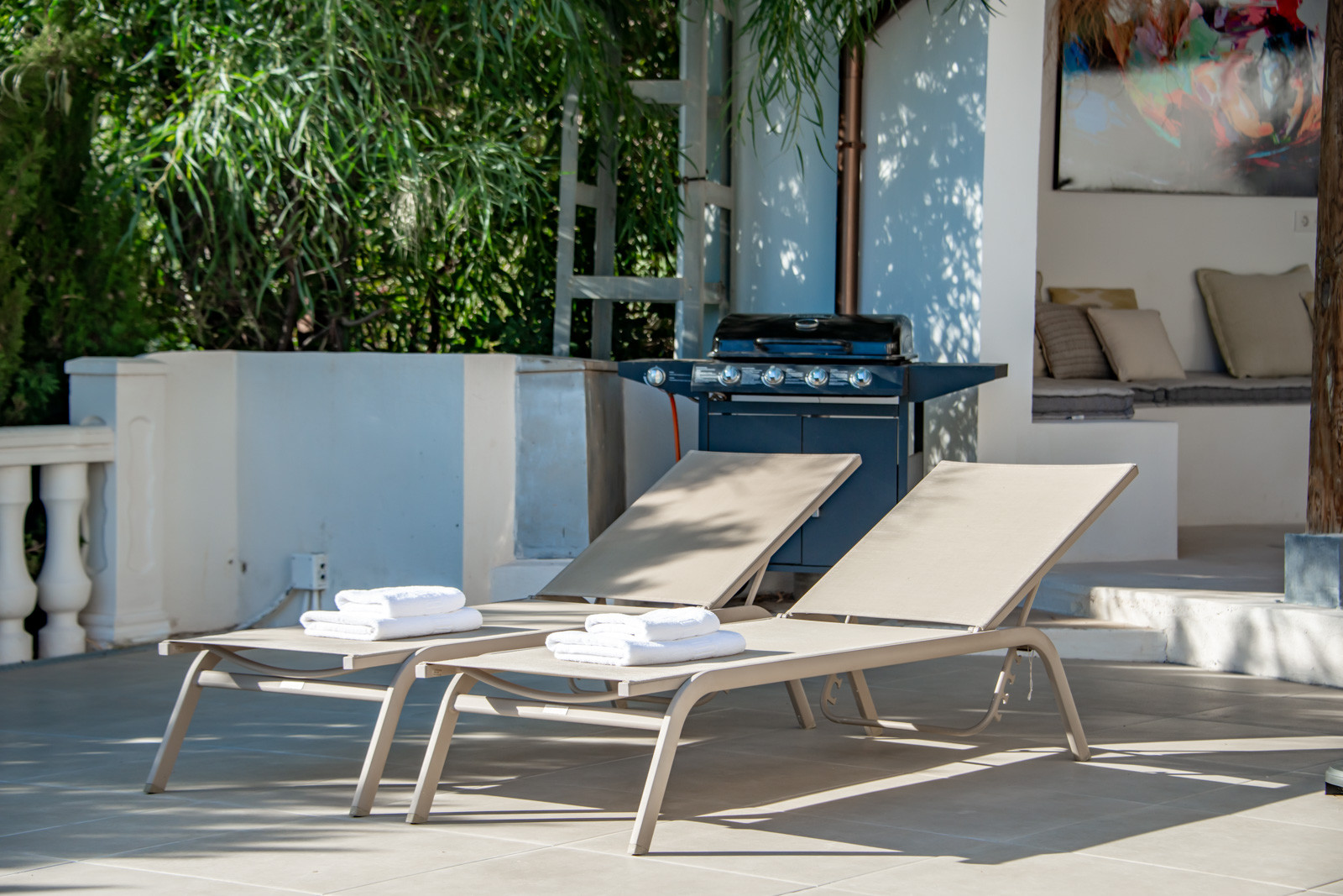 Im Außenbereich mit 854 m² Grundstücksfläche können Sie sich unter einer hübschen Markise entspannen, neben einem langen Esstisch für bis zu 10 Personen, einem erfrischenden Privatpool, Sitzbereichen mit Sonnenliegen und Poufs und einem Gasgrill für Mahlzeiten im Freien.