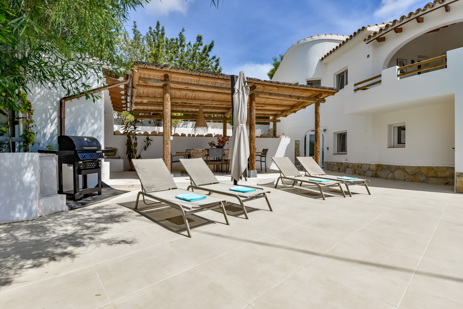 Rund um die Villa gibt es ein großes Grundstück mit Obstbäumen wie Zitronen- und Feigenbäumen, eine überdachte Terrasse mit einem Tisch zum Essen im Freien, eine Liegewiese vor dem Pool und einen Grill mit einem kleinen Gartentisch.