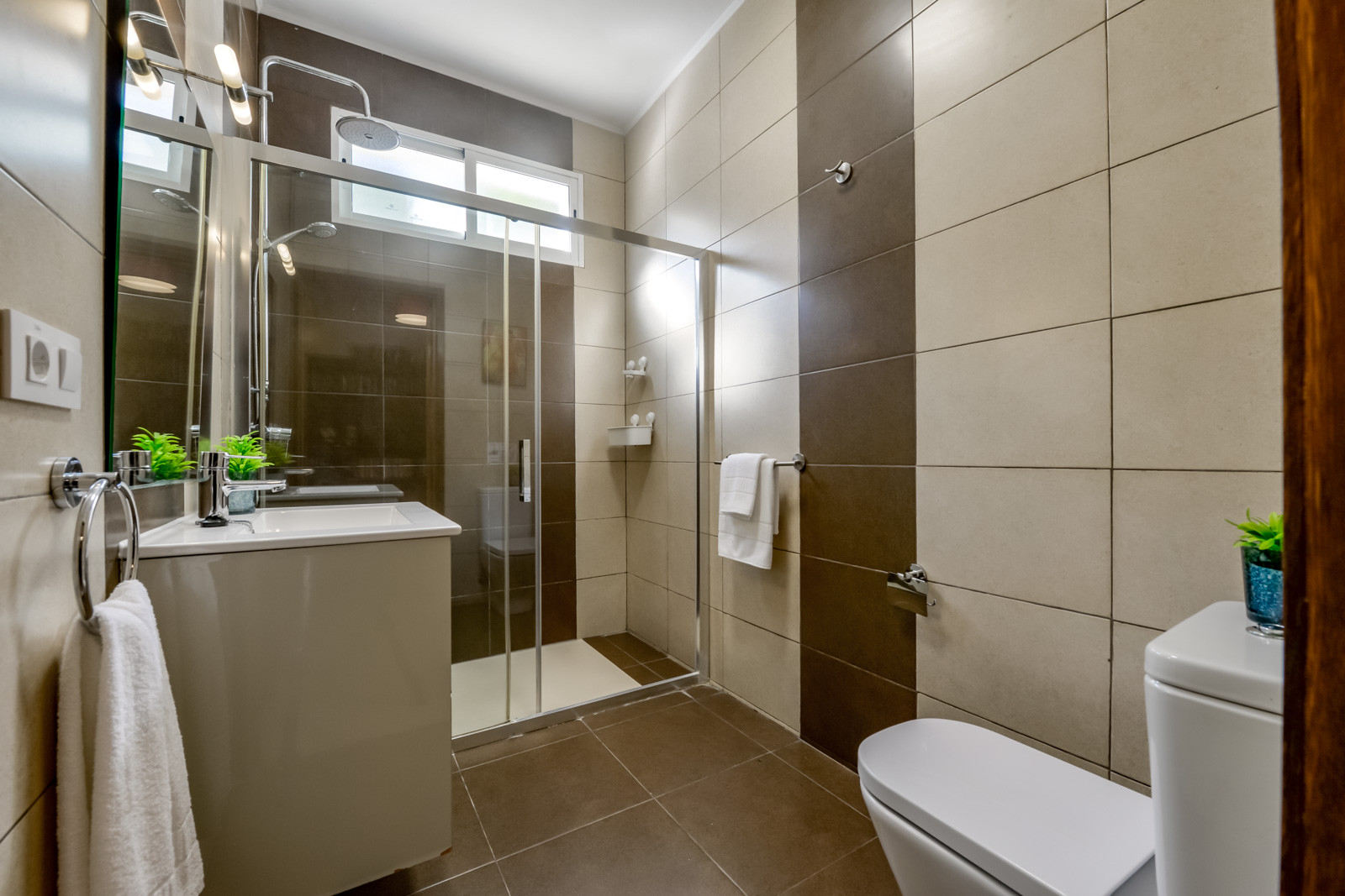 Im Erdgeschoss finden Sie ein Schlafzimmer mit zwei 80cm/200cm Boxspringbetten und Deckenventilator, ein weiteres Schlafzimmer mit einem 90cm/190cm Boxspringbett und Deckenventilator, ein drittes Schlafzimmer mit Doppel-Boxspringbett (2 untrennbare 80cm/200cm Matratzen), Deckenventilator und en-suite Badezimmer mit Regendusche, Wohnzimmer mit Klimaanlage und einem zweiten Fernseher mit Chromecast für mehr Unterhaltungsmöglichkeiten, Esstisch für sechs Personen, eine weitere voll ausgestattete Gasküche mit Backofen, Geschirrspüler, Kühl- und Gefrierschrank und ein Badezimmer mit begehbarer Regendusche.
