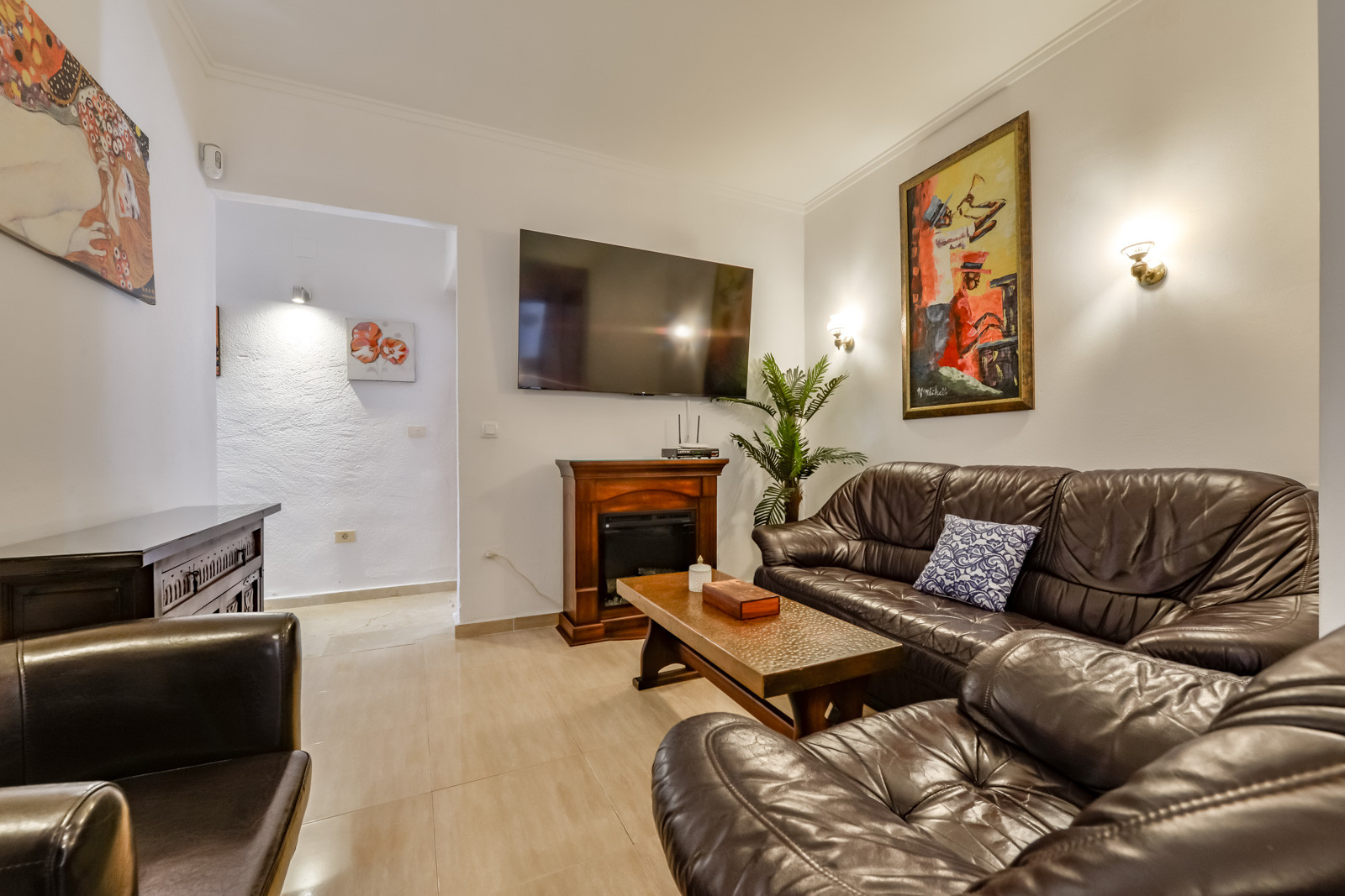 Es gibt ein geräumiges Wohn-Esszimmer mit Klimaanlage und einem dekorativen Kamin, eine große unabhängige und voll ausgestattete Küche, ein erstes Schlafzimmer mit zwei Einzelbetten, Klimaanlage und ein eigenes Bad mit Dusche. Ein zweites Schlafzimmer mit Doppelbett und Klimaanlage, ein drittes Schlafzimmer mit zwei Einzelbetten und Klimaanlage und ein viertes Schlafzimmer mit Doppelbett, en-suite Badezimmer mit Dusche und Klimaanlage. Die Villa verfügt über ein drittes Badezimmer mit Dusche und großem Waschbecken. Die gesamte Villa ist mit Zentralheizung ausgestattet.
