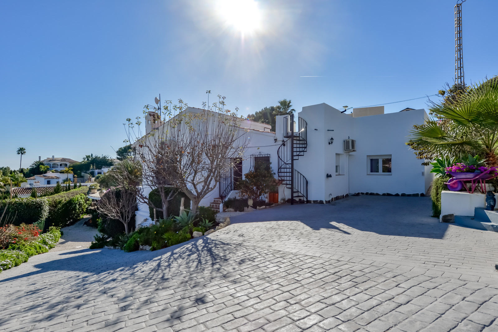 Es befindet sich 1,2 km vom Golfplatz, 1,8 km vom Supermarkt, 3 km von der Stadt Moraira und dem Sandstrand „Playa L' Ampolla“, 120 km vom Flughafen „Alicante“ entfernt. Es befindet sich in einer idealen Gegend für Familien und in einem Wohngebiet.