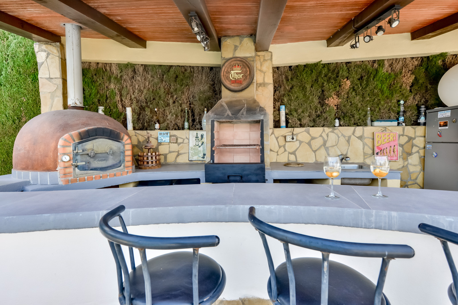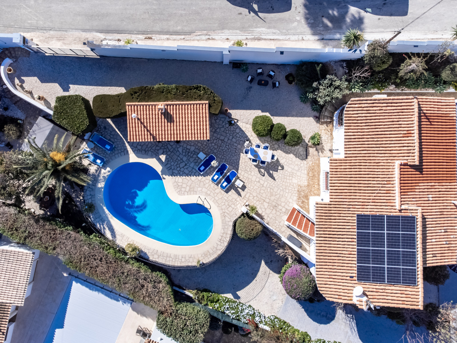 Mit 1.125 m2 Grundstück verfügt die Villa über mehrere Gartenbereiche, Obstbäume auf dem gesamten Grundstück und Erholungsräume, in denen Sie sich ausruhen und mit Familie und Freunden treffen können. Der Poolbereich verfügt über eine fantastische Bar mit Grill und Waschbecken im Freien, wo Sie lustige Momente vor dem Pool verbringen können, sowie einen überdachten Terrassentisch für Mahlzeiten im Freien, Hängematten zum Sonnenbaden, Pooldusche und eine angenehme Ecke mit Sitzgelegenheiten im Freien. Wenn Sie eine kurze Treppe hinuntergehen, gelangen Sie in den unteren Teil des Gartens, wo wir einen neuen Außenbereich mit einem zweiten Grill für große Braten und einem Esstisch finden, der zu einem schönen Ort für Familienfeiern im Freien wird. Das Grundstück hat einen überdachten Platz, um zwei Fahrzeuge darin zu parken.