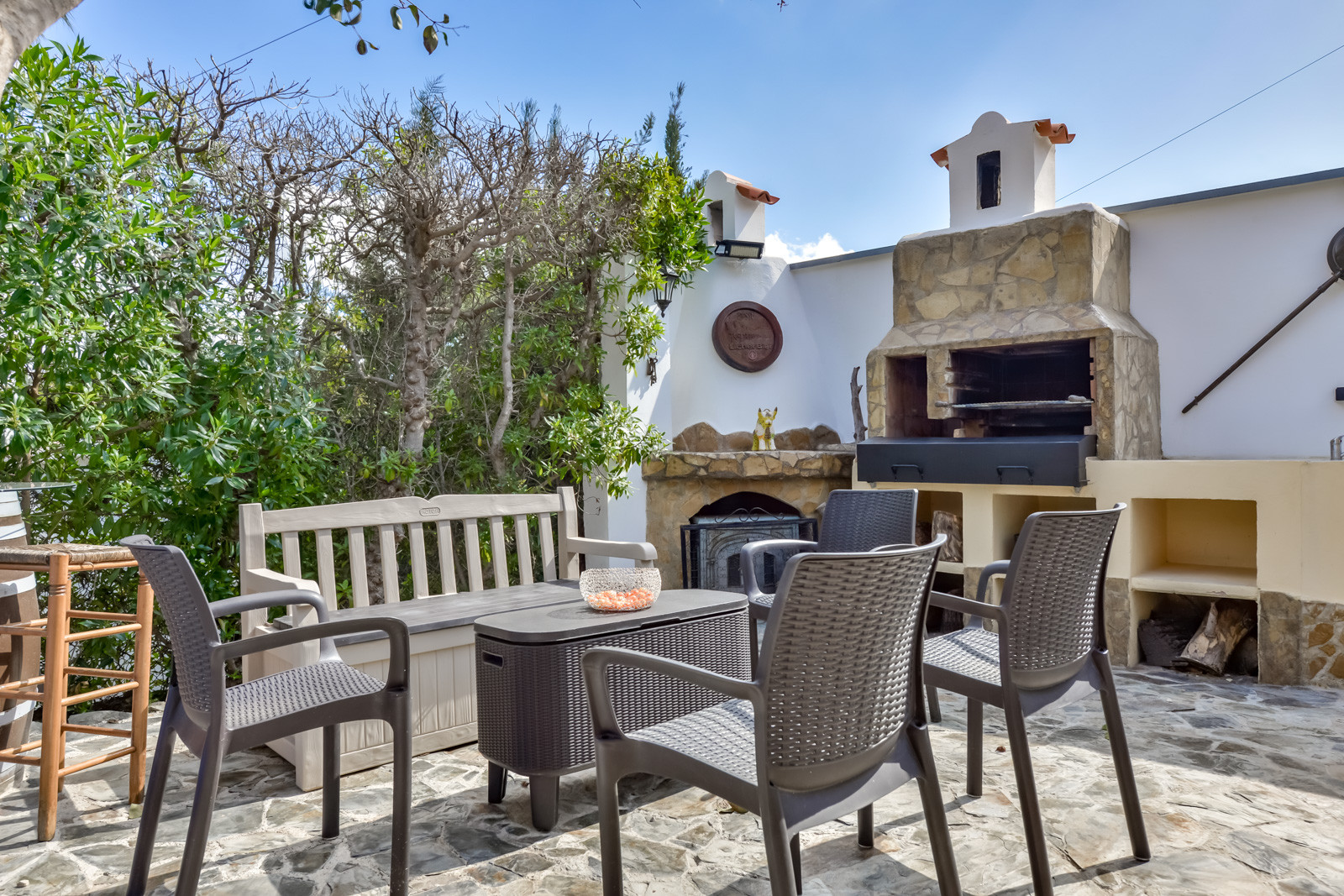 Im Außenbereich mit 854 m² Grundstücksfläche können Sie sich unter einer hübschen Markise entspannen, neben einem langen Esstisch für bis zu 10 Personen, einem erfrischenden Privatpool, Sitzbereichen mit Sonnenliegen und Poufs und einem Gasgrill für Mahlzeiten im Freien.