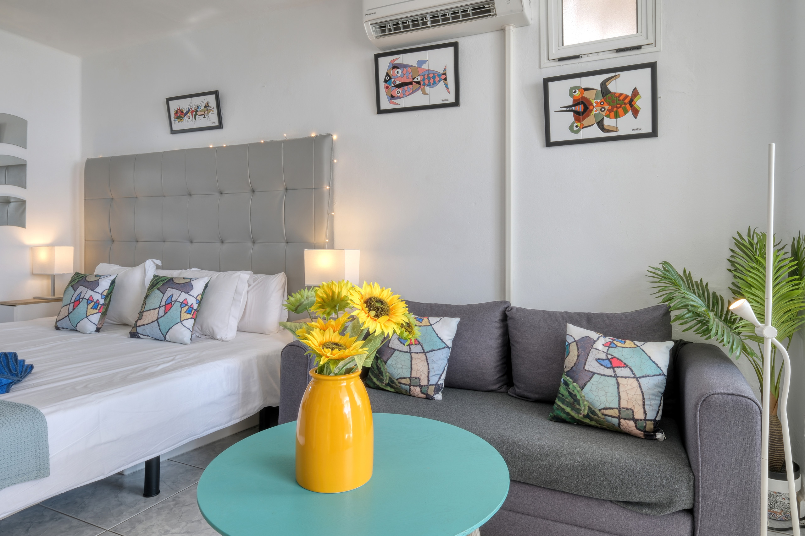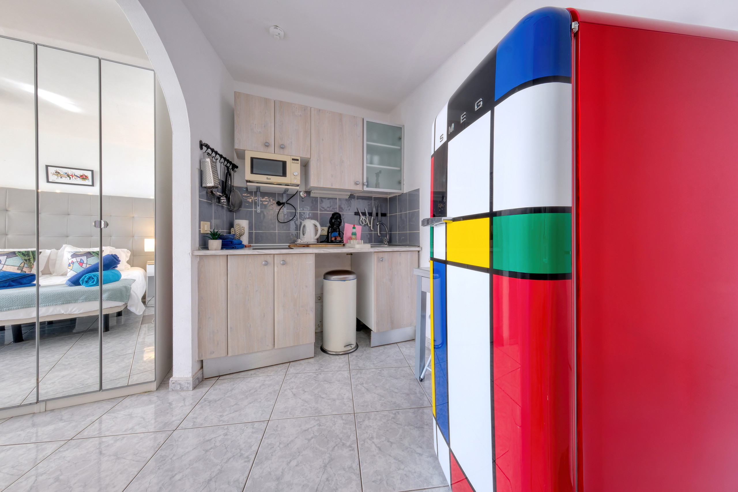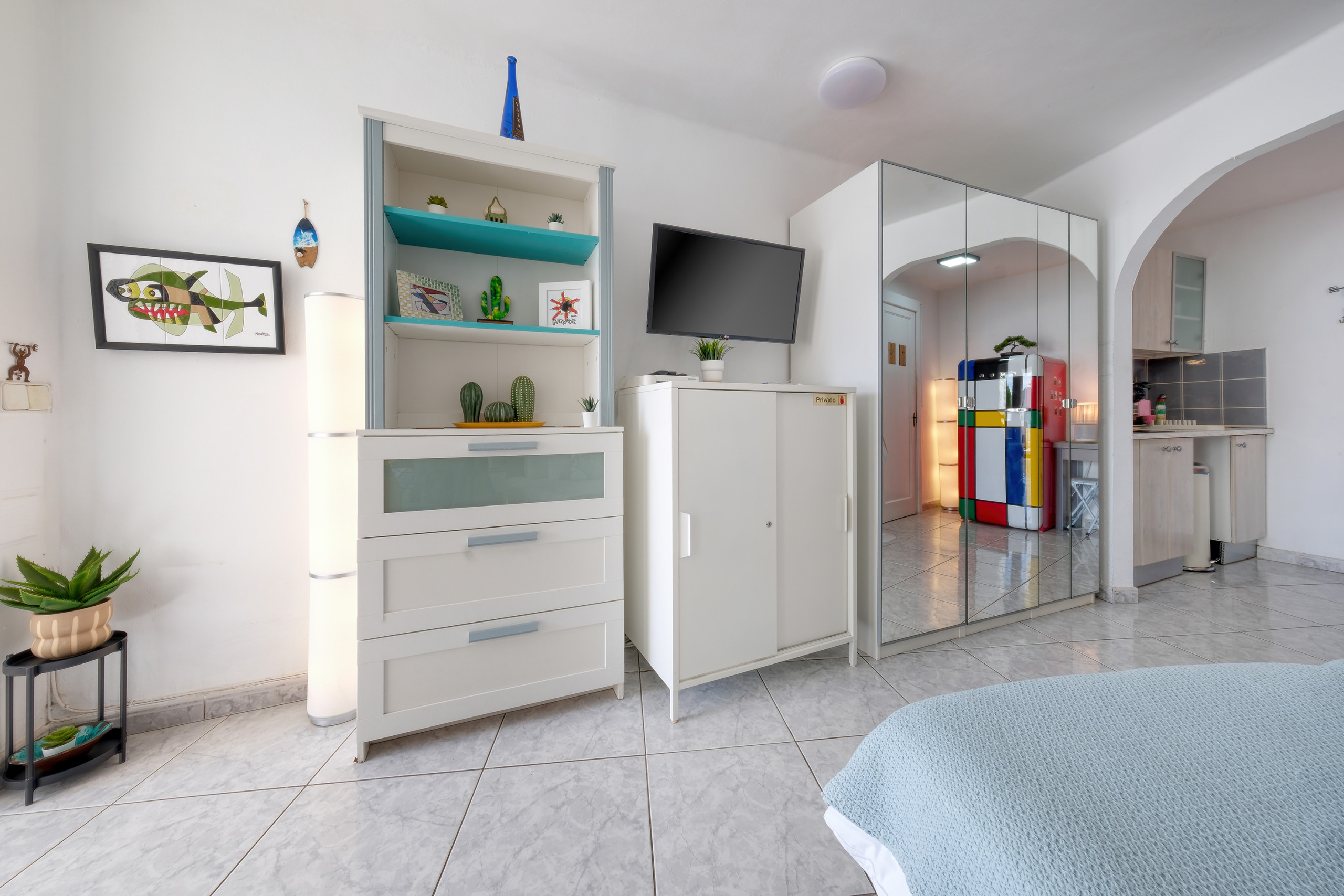 The accommodation is cosy and bright. The kitchen is fully equipped with a ceramic hob, microwave, coffee maker, toaster, kettle and all utensils. The studio has an outdoor dining table on the terrace to enjoy the views while having a drink or eating, and also two sun loungers to relax in the sun. It is also ideal if you need to telework, as it has fast wifi and a SMART TV.