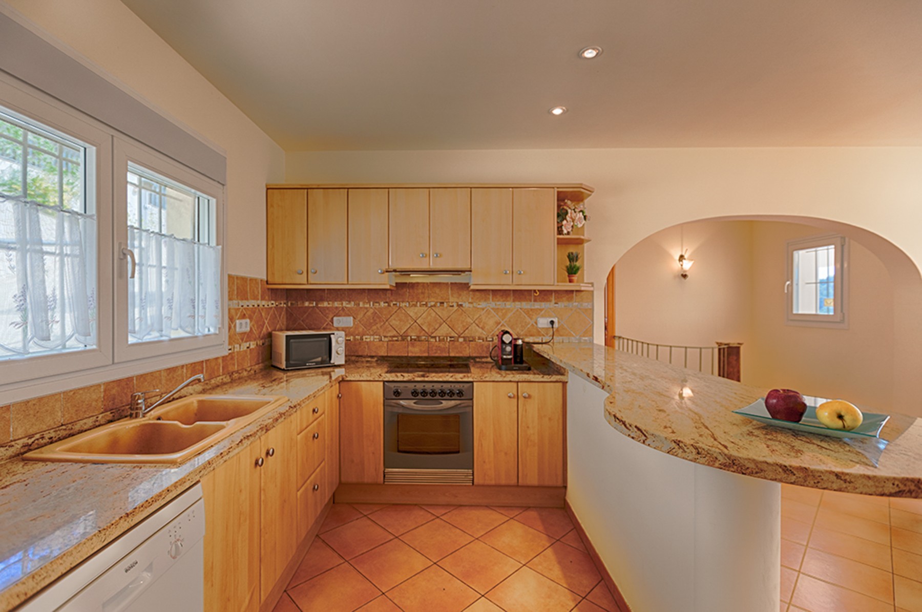 It is located in a residential area and ideal for families. It is located 1 km from the golf club, 2.5 km from supermarket and restaurants, 3.8 km from Moraira and Moraira beach 6 km from La Fustera beach in Benissa.