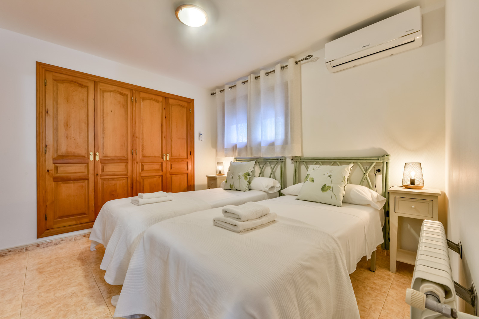 The villa has 120 m2 of living space and is distributed on a single floor. The first thing we find is a small glazed terrace with plenty of natural light, an American fridge with two doors, and connected by an arch, we find the living room with a sofa, TV area and table for lunch and dinner, a bedroom with double bed of 135, a second bedroom with double bed (two single beds together), the third bedroom also has two single mattresses together. A full bathroom with bathtub, a small but well equipped kitchen and central air conditioning throughout the house. From the entrance hall and newly built, we find a complete bathroom with shower and an access to the fourth bedroom, with double bed and large windows with access to the pool and terrace area.