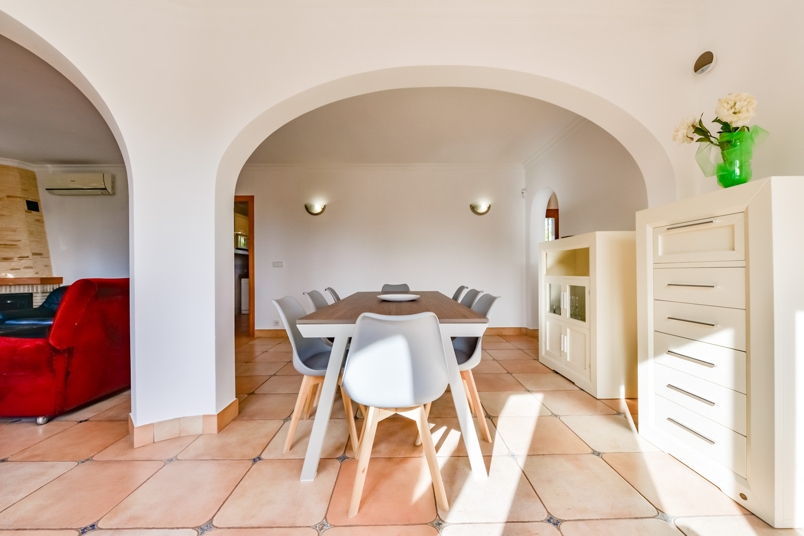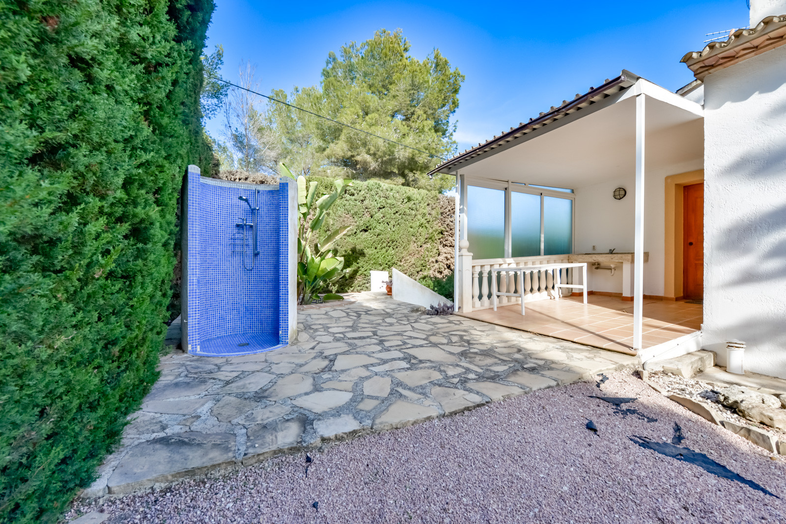 It is located 2 km from restaurants, 3 km from supermarkets, 3 km from the Ifach golf course, 4 km from the rocky beach ‘Cala Advocat, 6 km from the sandy beach of L'Ampolla de Moraira, 90 km from Alicante airport and is located in an ideal area for families and within an urbanization.